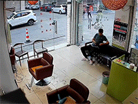 Khách cắt tóc ngỡ ngàng khi người phụ nữ đang dắt xe máy bất ngờ mất lái, lao vỡ cửa kính