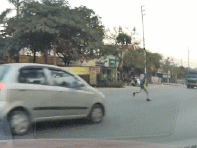 Phát hiện thấy nam thanh niên chạy sang đường, tài xế ô tô lập tức phanh gấp để tránh xảy ra va chạm. Sự việc được ghi lại vào ngày 25/12, trên quốc lộ 21 Phú Mãn, Quốc Oai, Hà Nội.