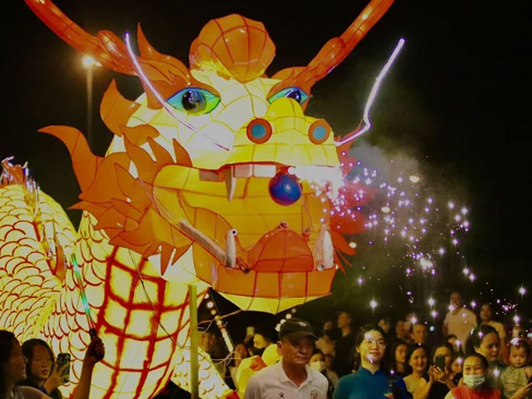 Tối 23/9 (tức 9/8 âm lịch), hàng nghìn người dân đổ về khu vực phường Nguyễn Du (thành phố Hà Tĩnh) tham gia lễ hội rước đèn trung thu, chiêm ngưỡng những linh vật khổng lồ đi trên phố.