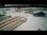 Kinh hoàng ô tô bị tàu hỏa húc văng dù đã có cảnh báo của người đi đường