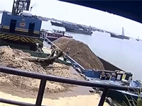 Dù chưa được thiết kế khá to lớn, nhưng chiếc xà lan đã bất ngờ bị gãy đôi ngay khi lượng cát mới được múc già nửa.