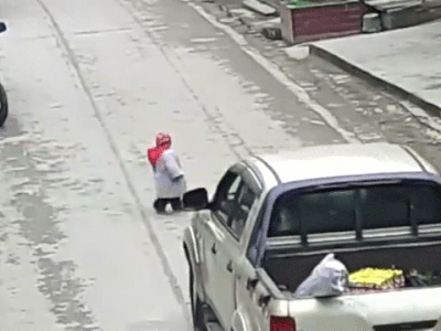 Cố lao ra trước đầu xe ô tô cứu con trai, người phụ nữ bị húc văng xuống đường nhưng may mắn chỉ bị thương nhẹ. May mắn là cả hai mẹ con chỉ bị thương nhẹ. Sự việc xảy ra tại Thành phố Khải Lý, tỉnh Quý Châu, Trung Quốc.