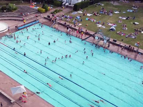 Cảnh quay bằng máy bay không người lái từ thị trấn spa Cheltenham, thành phố Gloucestershire, vương quốc Anh cho thấy hàng trăm người đang tụ tập tại các khu vực công viên nước Sandford Parks Lido nhằm xoa dịu cơn nắng nóng đang kéo dài ở "xứ sở sương mù"