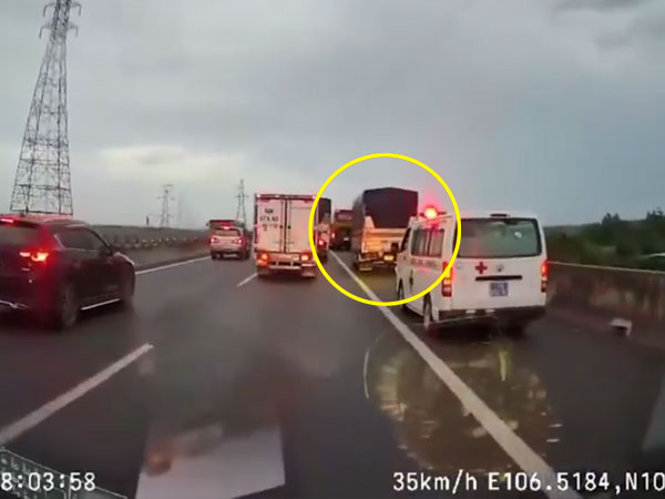 Dù có hai chiếc xe cứu thương hụ còi ưu tiên và xin nhường đường nhưng tài xế chiếc xe tải vẫn cố tình đi trên làn khẩn cấp. Khi bị nhắc nhở có ý thức tham gia giao thông, tài xế này còn quay ra thóa mạ người phục vụ bên y tế.