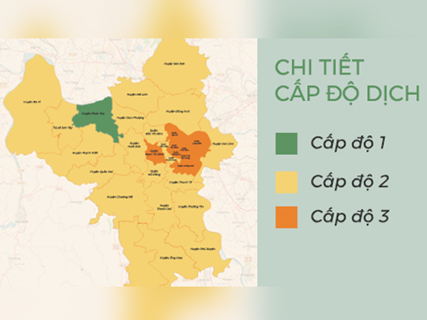 Theo đánh giá mới nhất của UBND TP Hà Nội về cấp độ dịch trong phòng, chống dịch Covid-19, có một huyện màu xanh; 21 quận, huyện màu vàng và 8 quận màu cam.