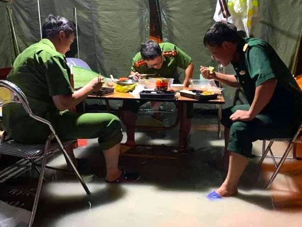 Bão số 2 gây mưa tầm tã, cán bộ trực chốt Covid-19 Hà Tĩnh ăn vội bát mỳ trong lều ngập nước