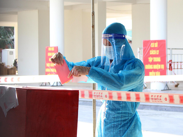 Các trường hợp F1 đang cách ly tập trung tại khu KTX Sinh viên phía Tây TP Đà Nẵng được bố trí một điểm bỏ phiếu ngay trong khu cách ly. Khi đi bầu cử, F1 phải mặc đồ bảo hộ, giữ khoảng cách 2 mét.