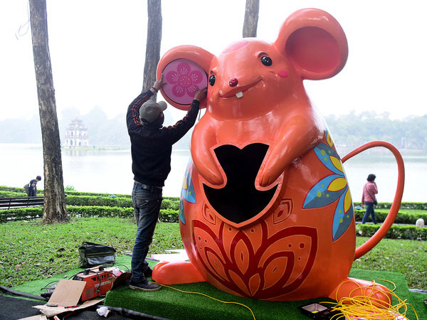 Tại nhiều địa điểm, đường phố, Hà Nội cho trang trí bằng những băng rôn, khẩu hiệu, biển lớn hay những hình tượng linh vật chuột đón Tết Canh Tý 2020.