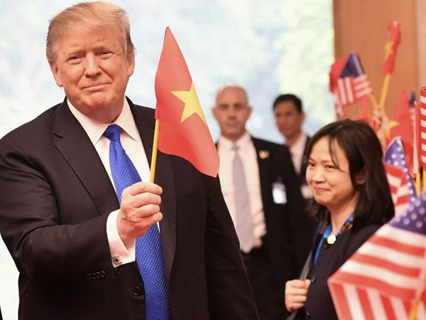 Tổng thống Trump bất ngờ dừng lại và cùng Thủ tướng Nguyễn Xuân Phúc giơ hai lá cờ Việt - Mỹ đáp lại sự đón chào của các em thiếu nhi ở trụ sở Chính phủ, trưa 27/2.