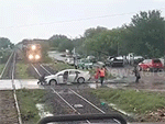 Xế hộp bị tàu hỏa kéo lê vì mắc kẹt trên đường ray