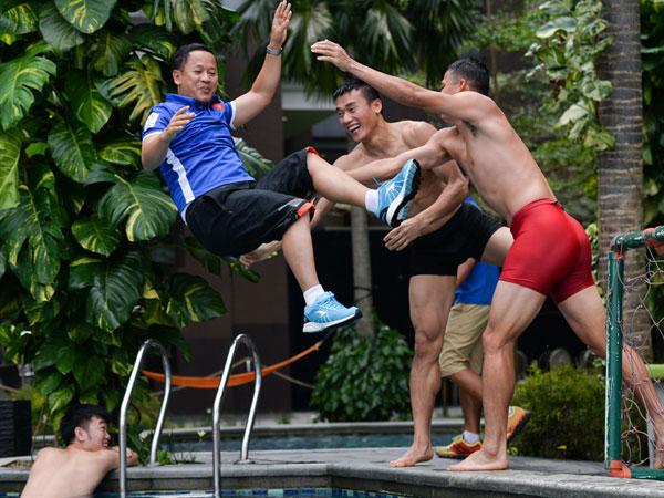 Khi cả đội bơi thư giãn, thấy trợ lý ngôn ngữ ngồi trên bờ, tiền đạo Anh Đức và thủ môn Bùi Tiến Dũng đã xông tới ném anh Lê Huy Khoa xuống bể bơi.