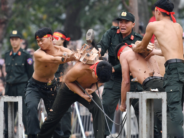 Dùng cơ thể làm bệ đỡ để đập vỡ tảng đá, nằm dưới bánh ô tô lăn qua người, kéo xe đặc chủng nặng 15 tấn... là những màn trình diễn khí công đỉnh cao của lực lượng cảnh sát ở phố đi bộ hồ Gươm (Hà Nội) vào chiều 9/3.