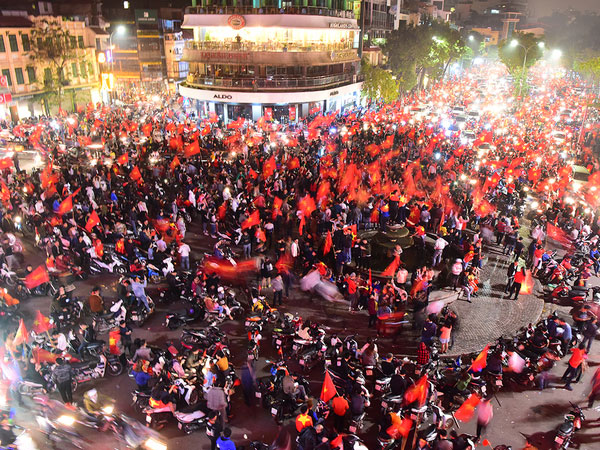 Gần nửa đêm, nhiều tuyến phố Hà Nội vẫn bạt ngàn cờ đỏ sao vàng cùng những tiếng hô vang "Việt Nam vô địch".