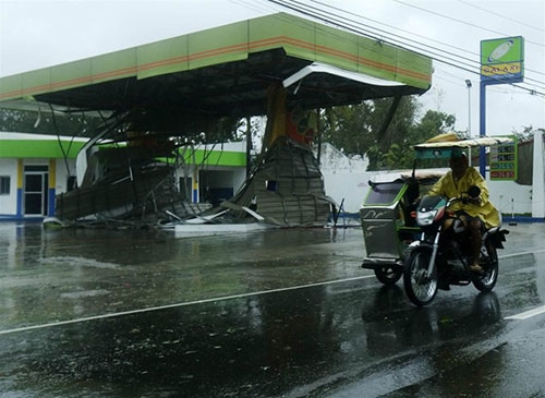 Trạm xăng ở thị trấn Munoz, tỉnh Nueva Ecija, hư hại nặng do bão. "Chúng tôi nhận tin nhiều ngôi nhà bị phá hủy, đường dây điện đứt, cây đổ khiến nhiều tuyến đường không thể lưu thông", Alexander Pama, giám đốc điều hành Cơ quan ứng phó và giảm nhẹ hậu quả thiên tai quốc gia, cho biết. Ảnh: EPA |