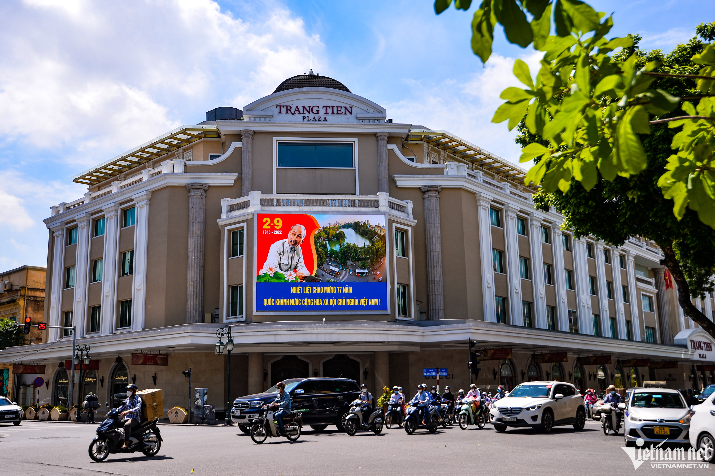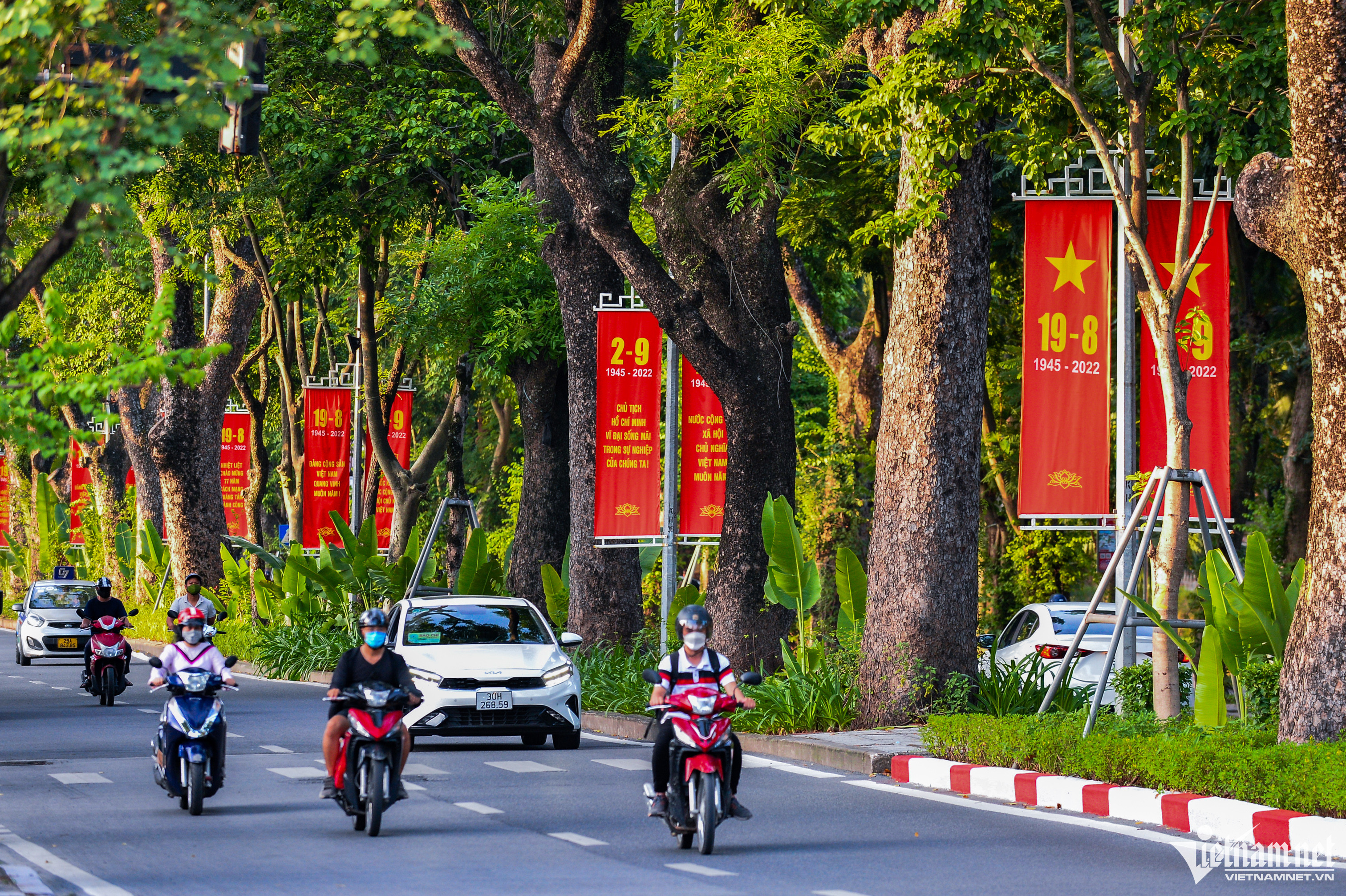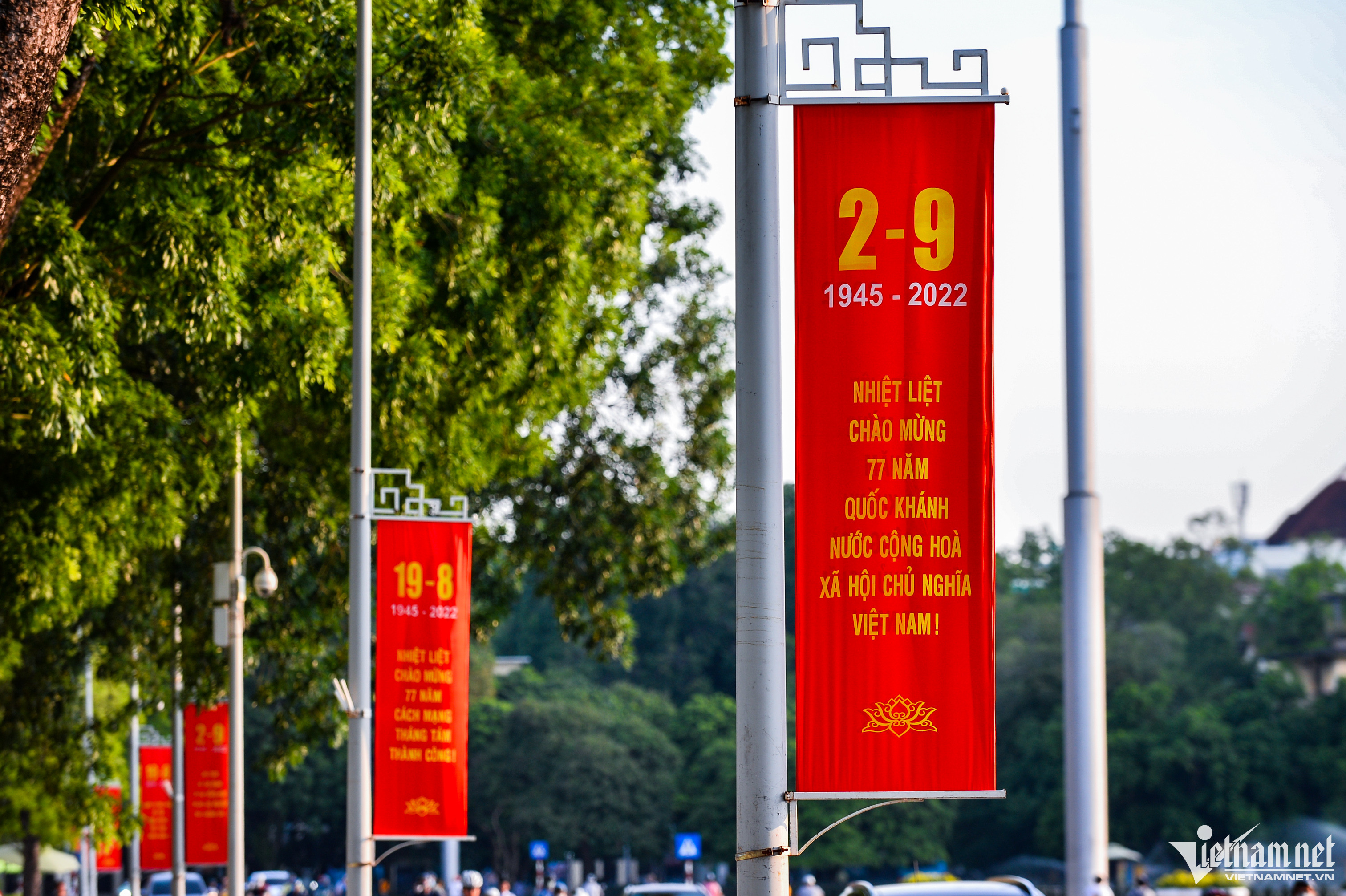 Đường phố Hà Nội đã được trang hoàng rực rỡ cờ hoa, pano, áp phích để chào mừng 77 năm Quốc khánh Việt Nam, ngày 2/9.