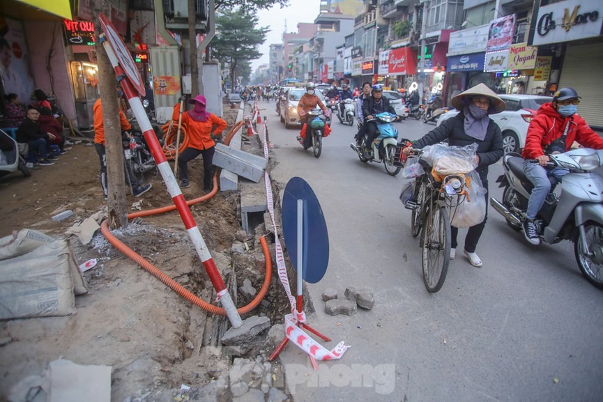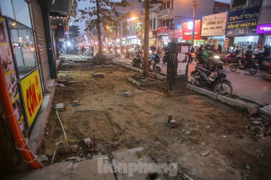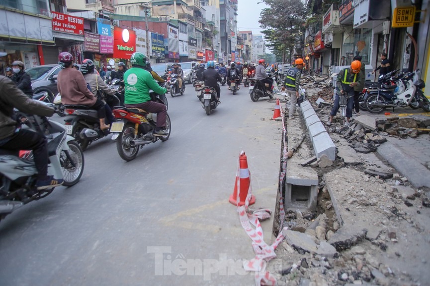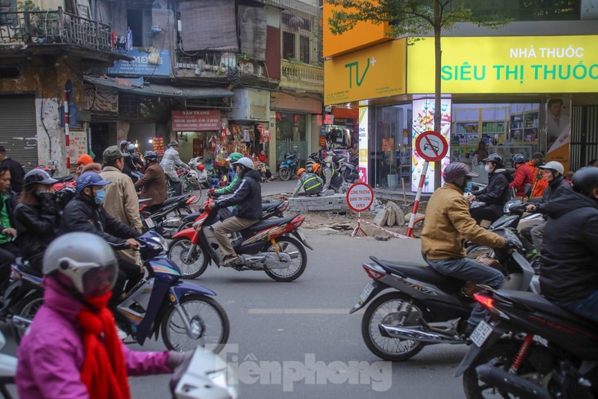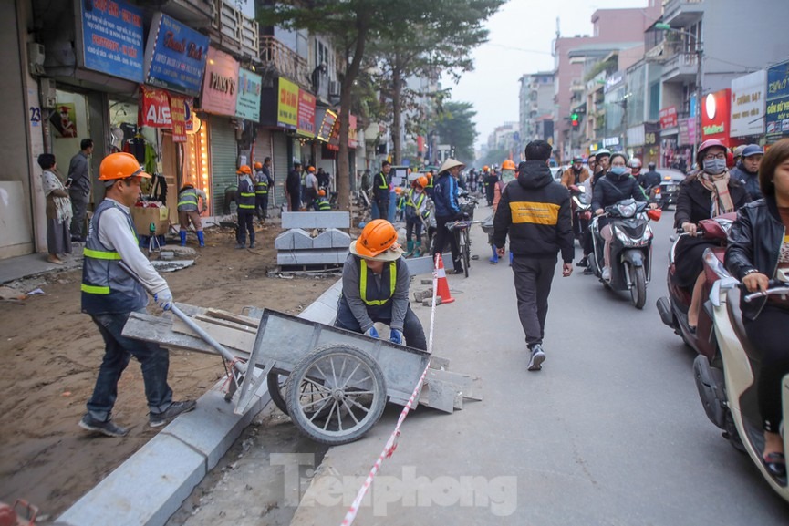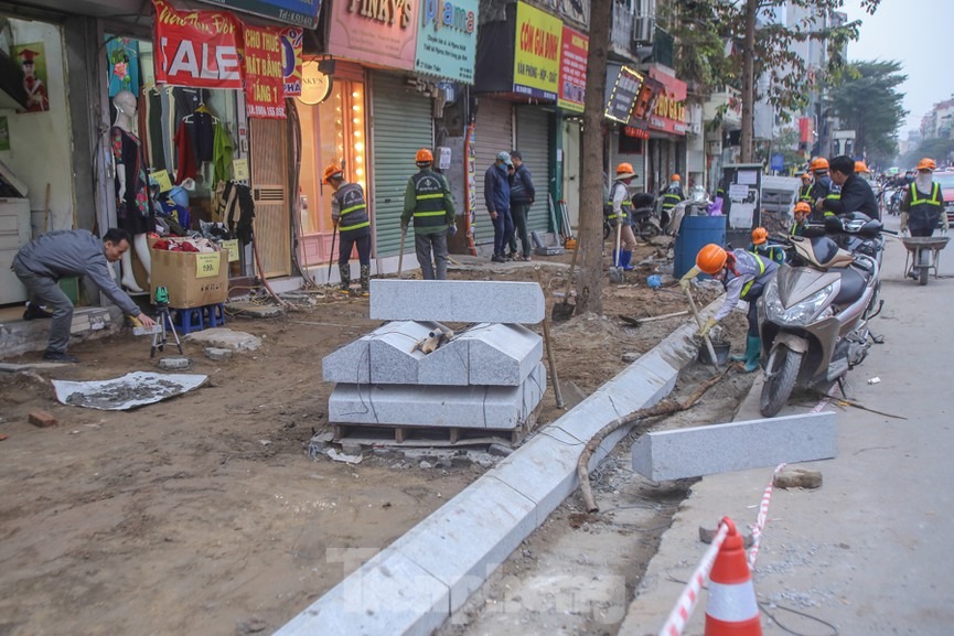 Theo ghi nhận của phóng viên, đúng vào dịp cuối năm, cao điểm đi lại của người dân, tuyến phố Khâm Thiên (quận Đống Đa, Hà Nội) lại được chỉnh trang, lát đá vỉa hè, gây thêm khó khăn cho giao thông của người dân trên tuyến phố vốn nổi tiếng ùn ứ vào mỗi giờ cao điểm.