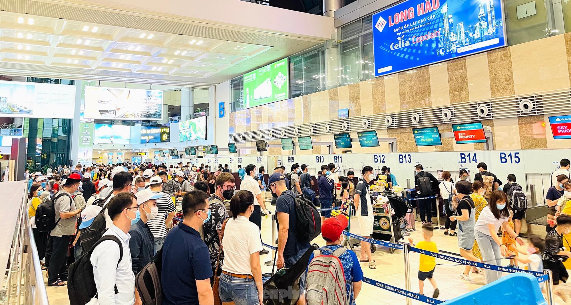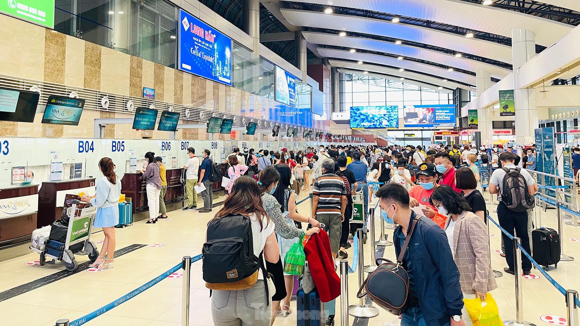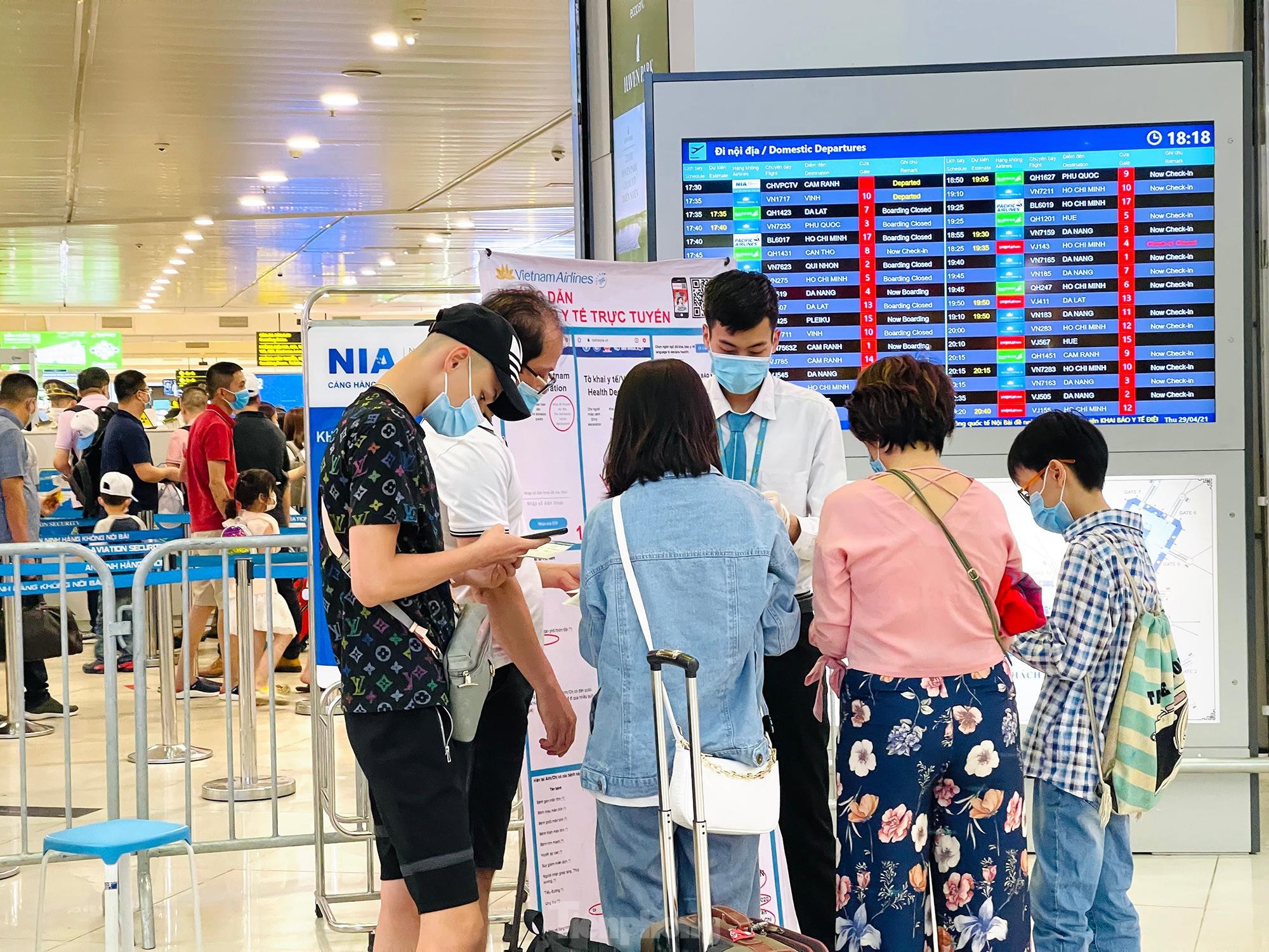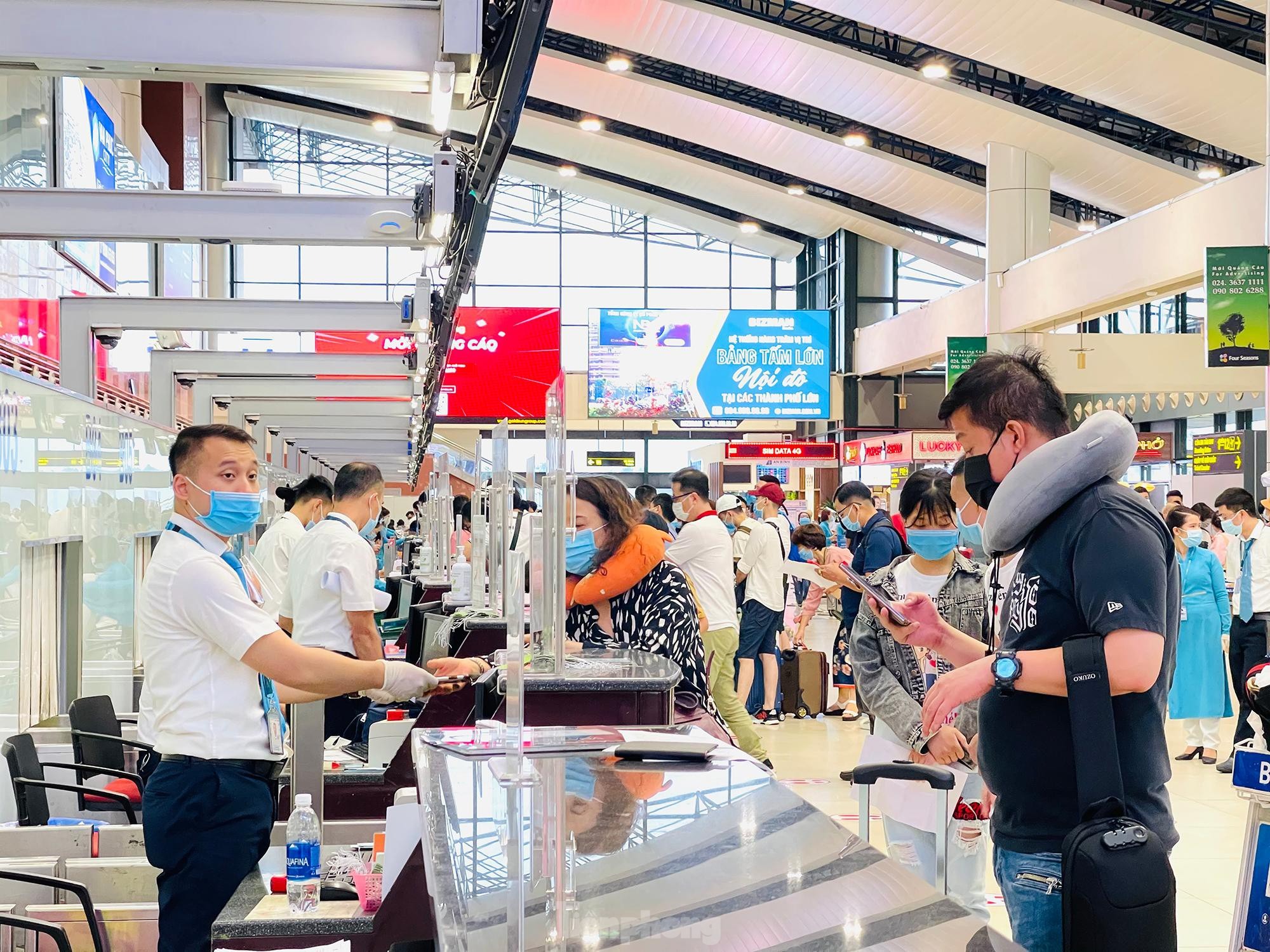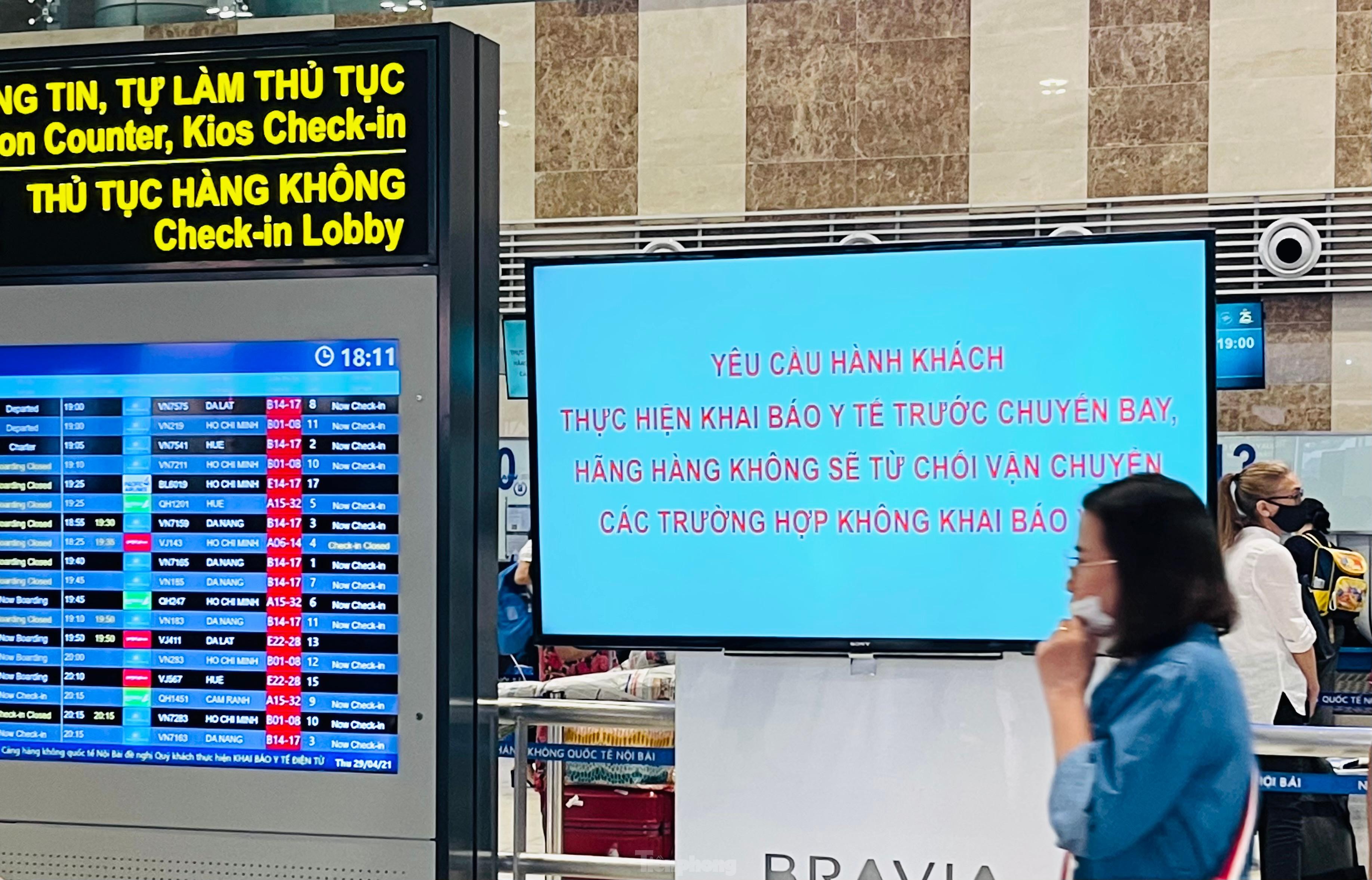 Chiều tối ngày 29/4, lượng khách tăng cao đột biến trước dịp nghỉ lễ 30/4 và 1/5 khiến khu vực check-in sân bay Nội Bài luôn trong tình trạng đông đúc, hàng dài hành khách đứng xếp hàng đợi làm thủ tục. Tuy nhiên, công tác phòng dịch COVID-19 không vì thế mà xao nhãng.