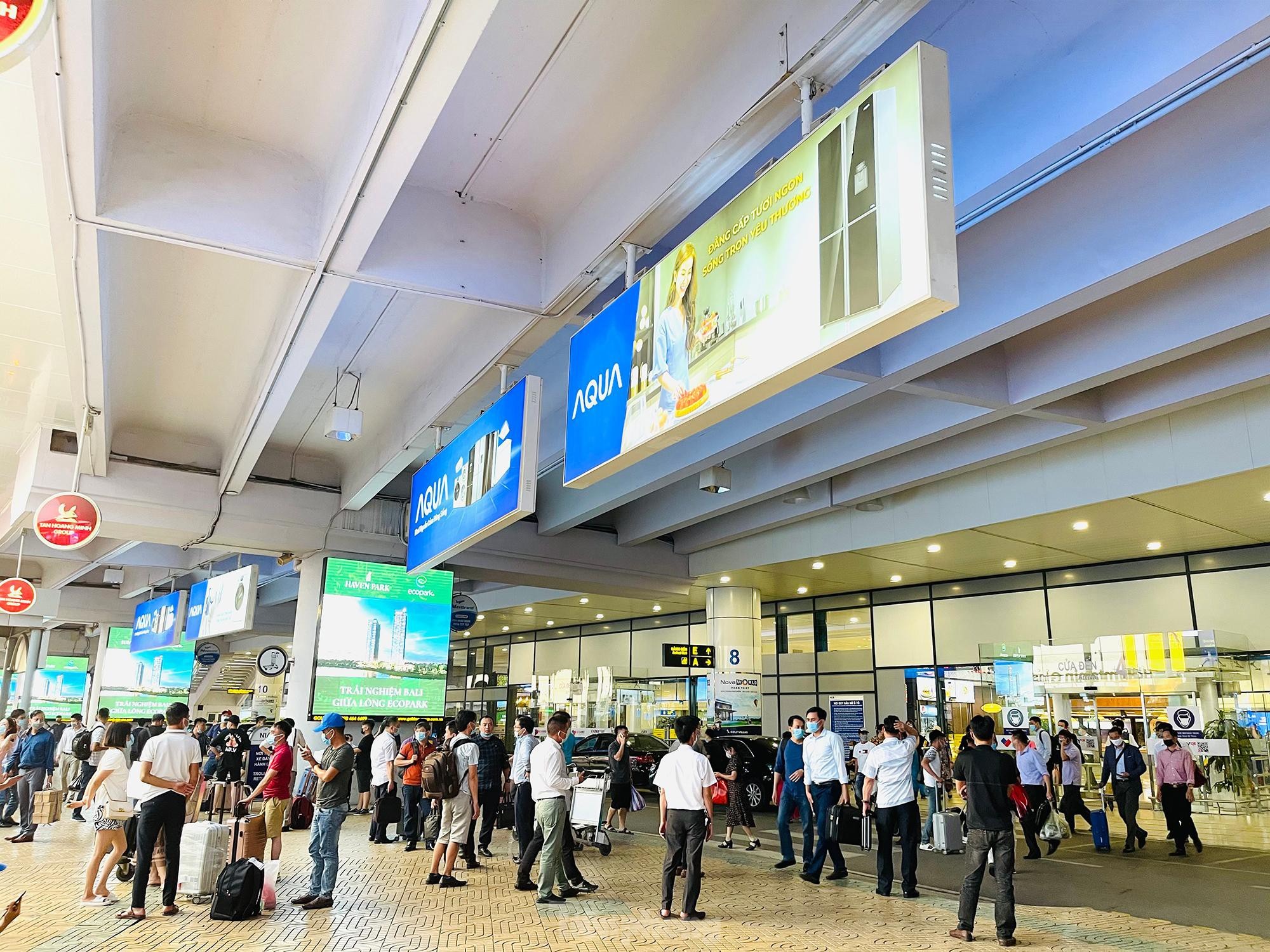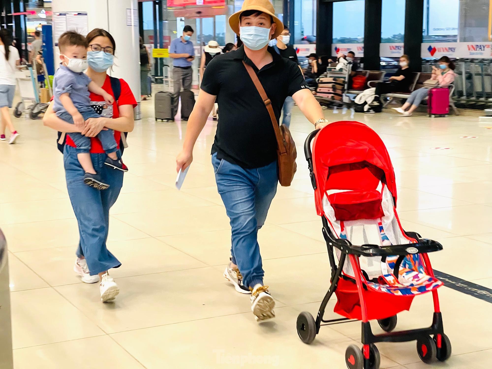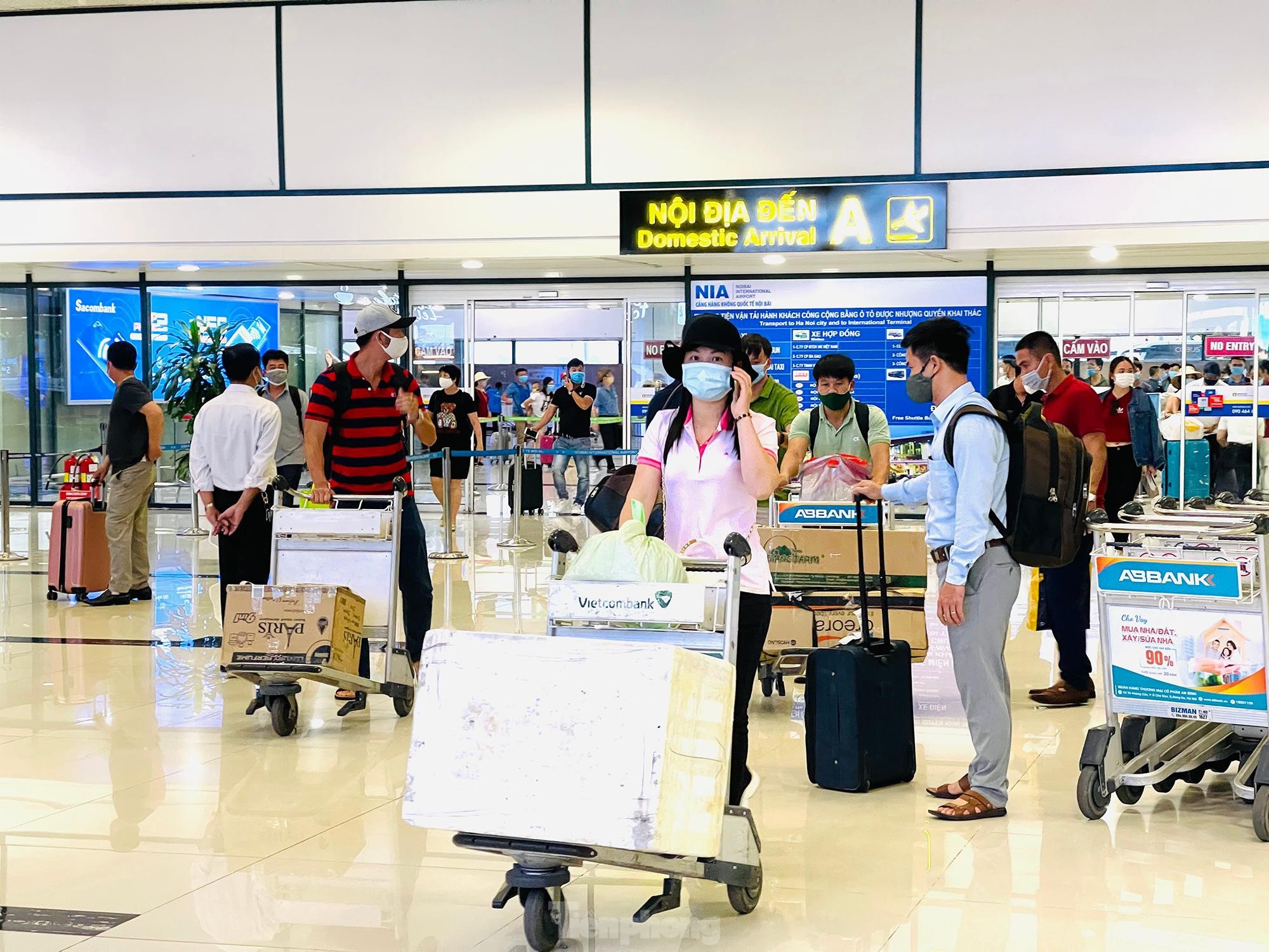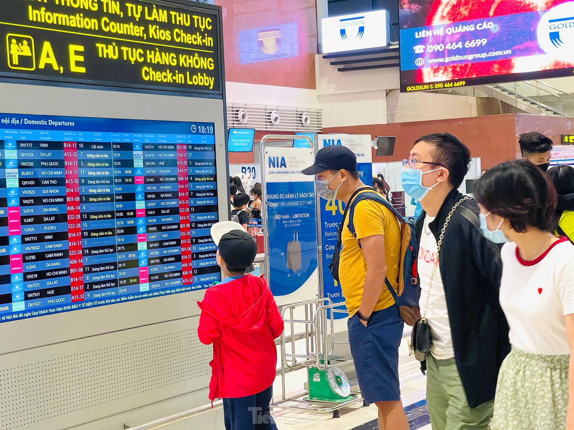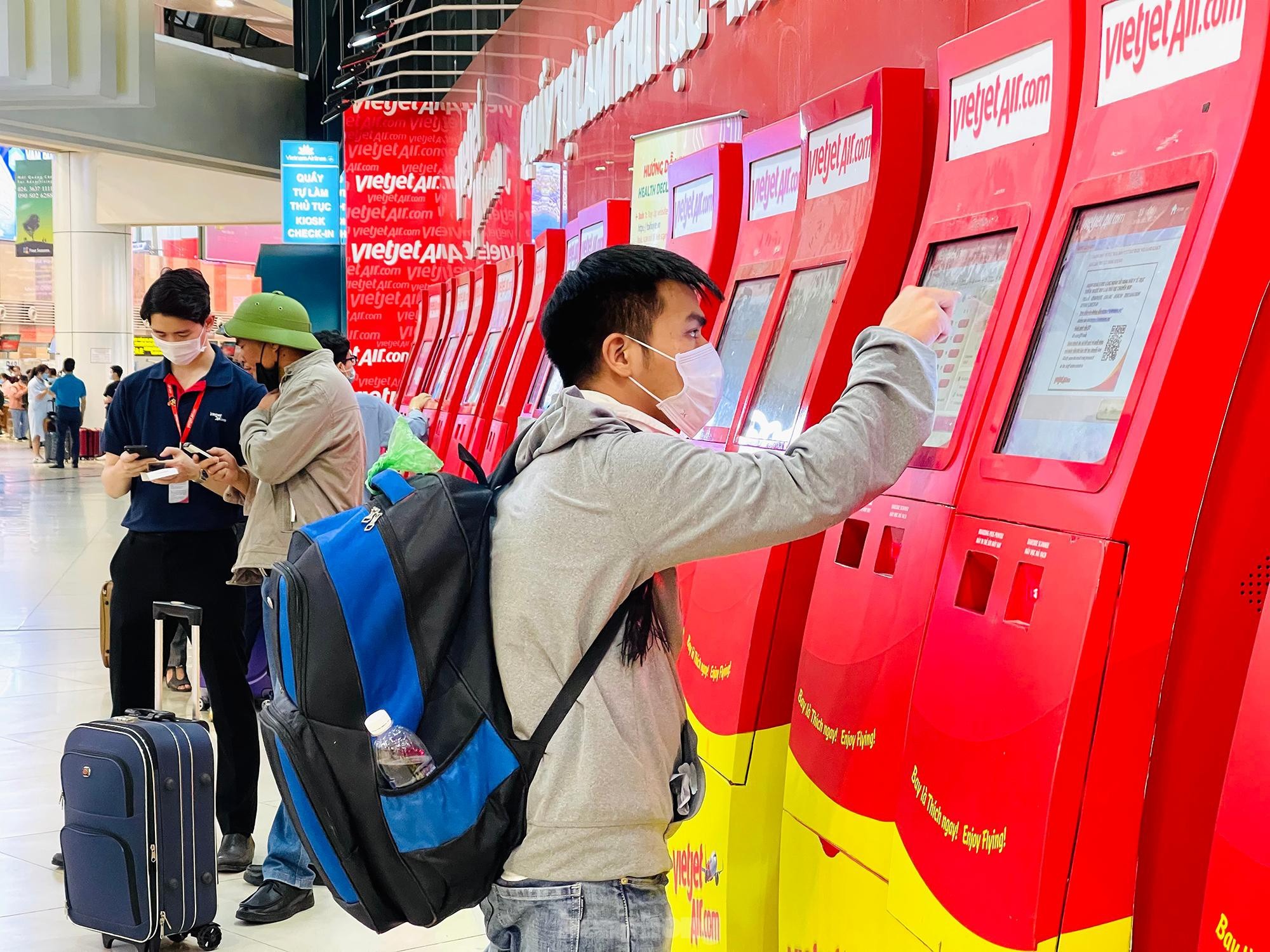Chiều tối ngày 29/4, lượng khách tăng cao đột biến trước dịp nghỉ lễ 30/4 và 1/5 khiến khu vực check-in sân bay Nội Bài luôn trong tình trạng đông đúc, hàng dài hành khách đứng xếp hàng đợi làm thủ tục. Tuy nhiên, công tác phòng dịch COVID-19 không vì thế mà xao nhãng.