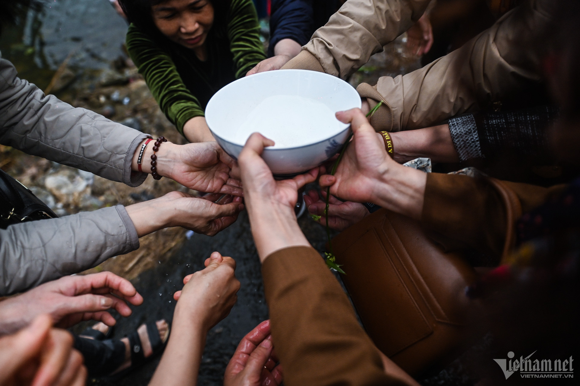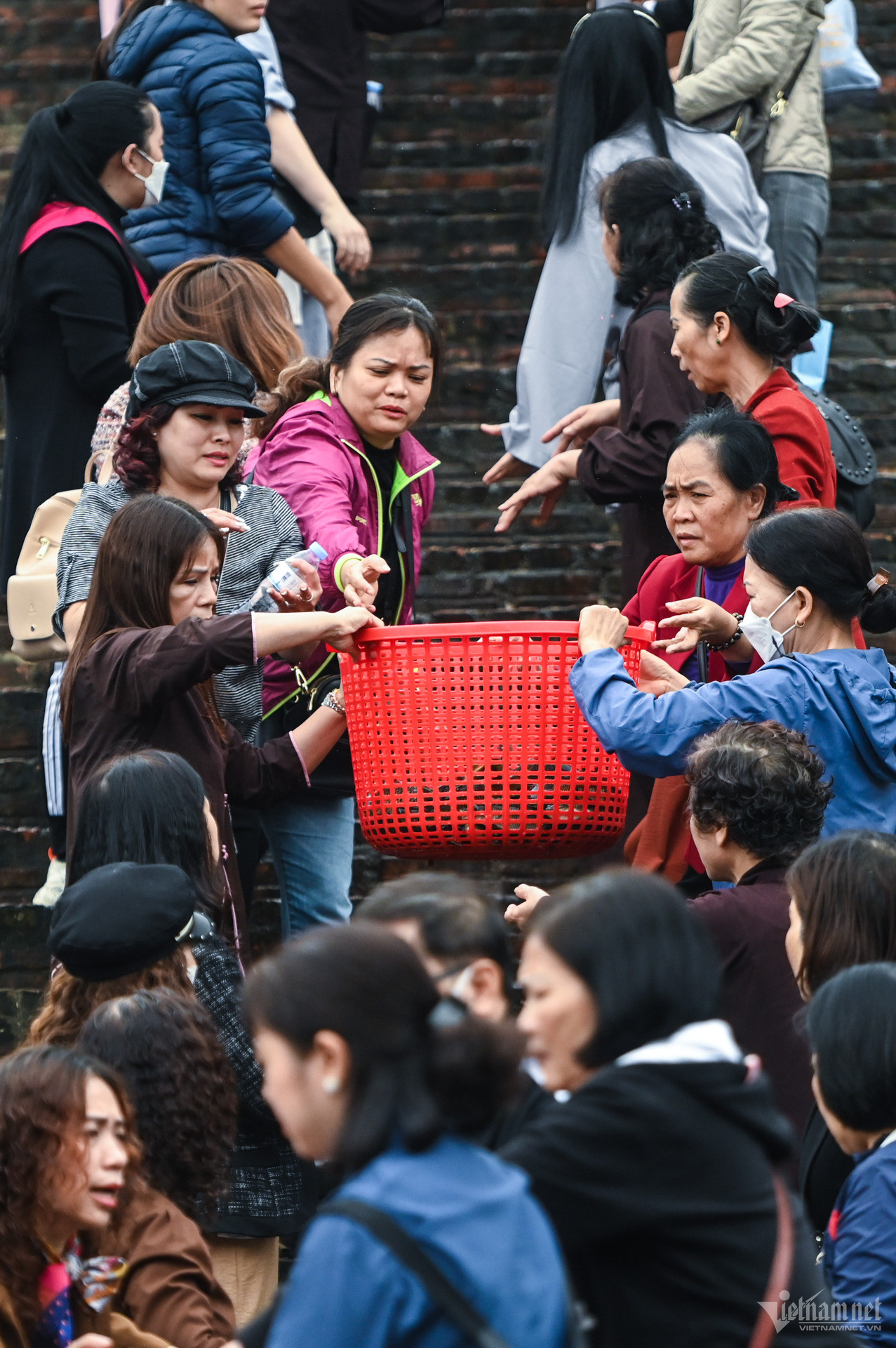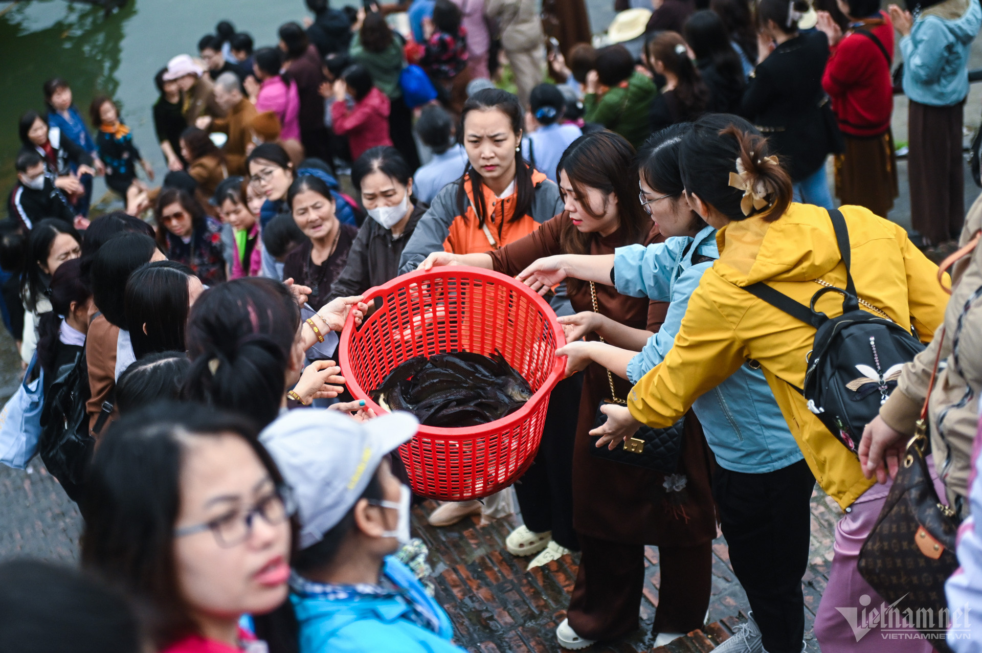 Hàng trăm người dân phóng sinh gần 7 tạ cá các loại tại đình làng Bát Tràng nhân dịp năm mới để mong cầu bình an.
