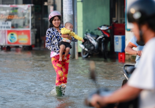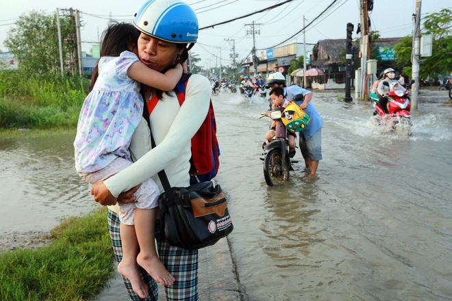 | Nữ công nhân bồng con trai 13 tháng tuổi qua đoạn nước ngập trên đường Lê Văn Lương. |