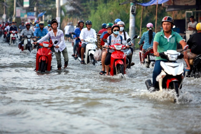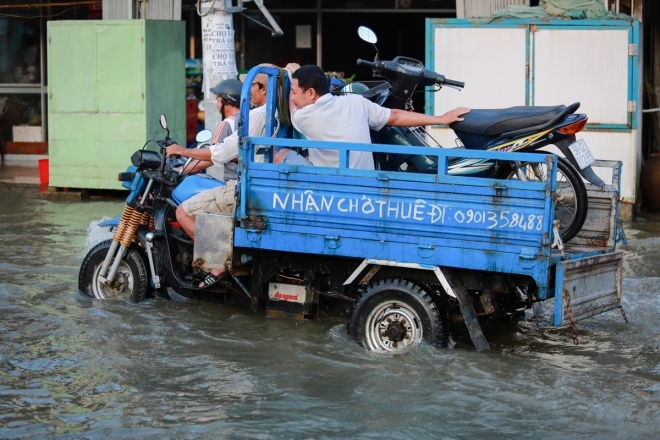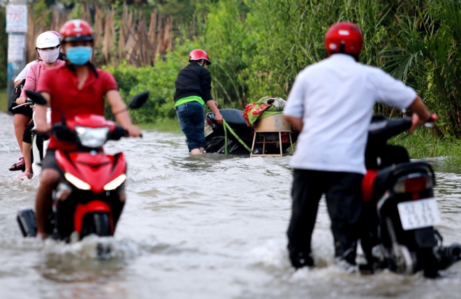 | Lúc 6h30, mực nước rút xuống còn gần nửa bánh xe đạp nhưng vẫn gây khó khăn cho các phương tiện đi lại. Theo dự báo của Đài khí tượng thủy văn khu vực Nam Bộ, lúc 6h ngày 16/11, đỉnh triều tại trạm An Phú trên sông Sài Gòn đạt 1,63 m và trạm Nhà Bè đạt 1,69 m lúc 5h sáng. Đến chiều 16/11, triều cường sẽ đạt đỉnh cao nhất tại trạm An Phú trên sông Sài Gòn là 1,66 m vào lúc 18h và 1,70 m tại trạm Nhà Bè lúc 17h30. Các ngày sau triều cường sẽ giảm dần. |