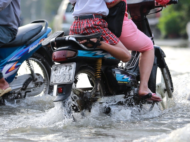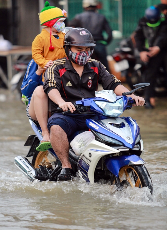 | Để tránh bị té ngã, nhiều phụ huynh phải cầm chắc tay lái chở con qua đoạn đường ngập gần cả bánh xe. |