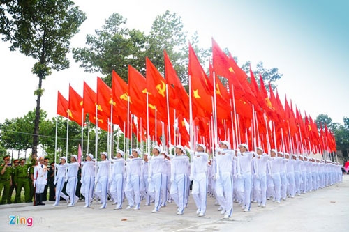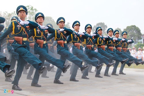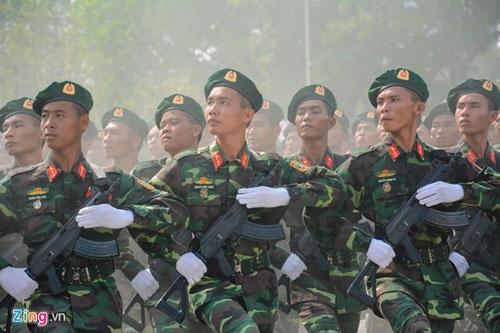 | Tổng cộng 31 khối, mỗi khối 100 người đại diện cho các lực lượng của quân đội, công an. Trong số này, hơn 1/3 là nữ giới. Mỗi ngày các chiến sĩ tập luyện hai buổi sáng và chiều bất chấp thời tiết để kịp tiến độ. "Nhiều đơn vị còn tranh thủ tập đêm để đội hình thuần thục”, một lãnh đạo Quân khu 7 cho biết. |