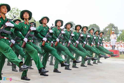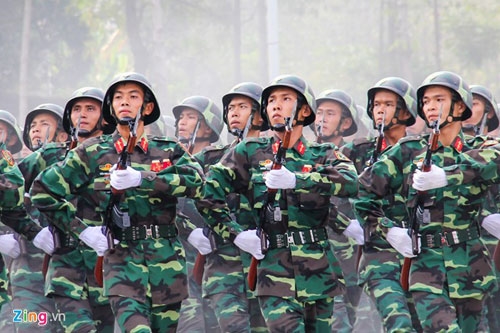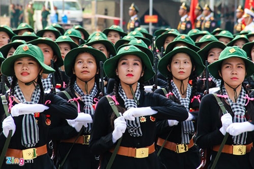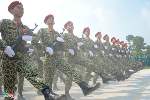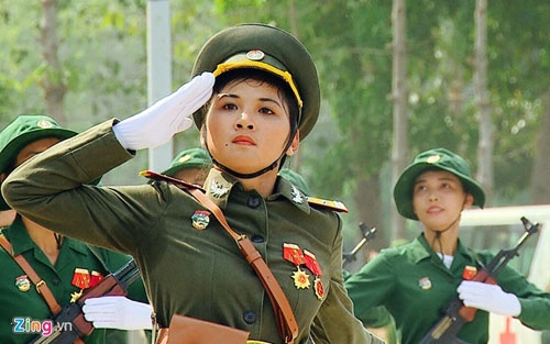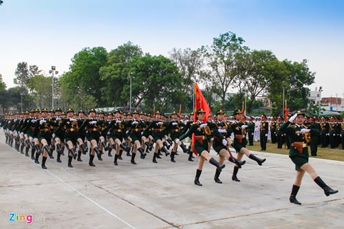 | Trong ảnh là phần luyện diễu binh của đội nữ chiến sĩ thông tin liên lạc. Sau một thời gian tập tại sân bay Hòa Lạc (Hà Nội), các chị em đã di chuyển vào TP HCM để ghép khối cùng hợp duyệt từ đầu tháng 4. |