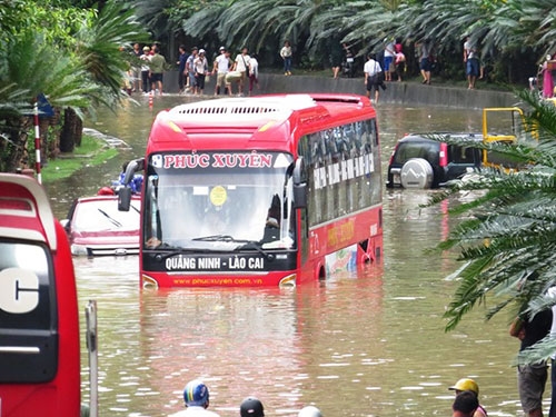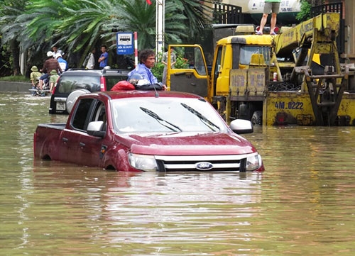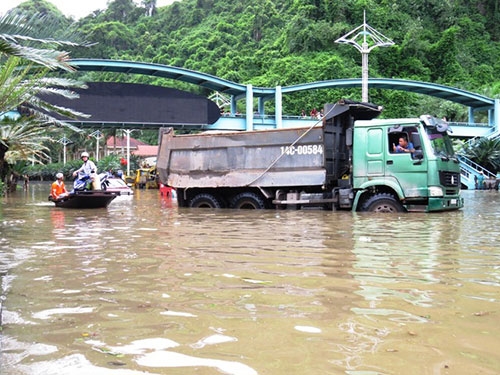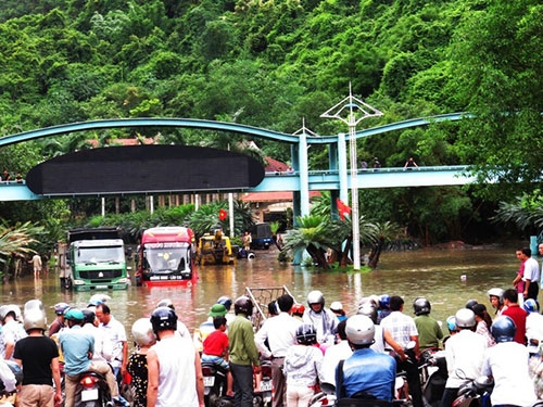 Khoảng 100 m quốc lộ bị ngập, điểm sâu nhất khoảng 1,5 m. Hàng trăm phương tiện không qua được chỗ ngập, đành dừng lại đứng chờ. Xe khách, xe bán tải cố vượt đều phải nằm lại nhiều giờ đồng hồ chờ cứu hộ. |