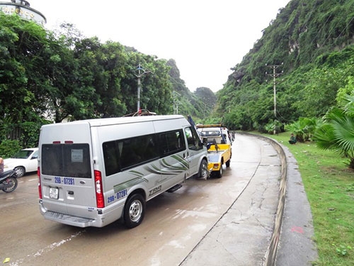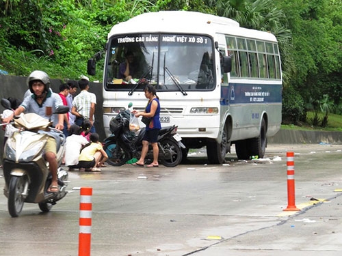 Ôtô đưa đón học sinh của Trường Cao đẳng nghề Việt Xô nằm chết máy tại khúc đoạn đường này từ cuối giờ chiều 26/7. Đến sáng nay, xe đã được cứu hộ kéo lên đường sửa chữa. |