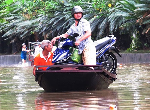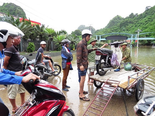 Một số người dân đưa xe kéo, thuyền máy ra chở người và phương tiện. Với giá 50.000 đồng/xe máy và 30.000 đồng/người, những chủ đò kiếm khá nhiều tiền. |