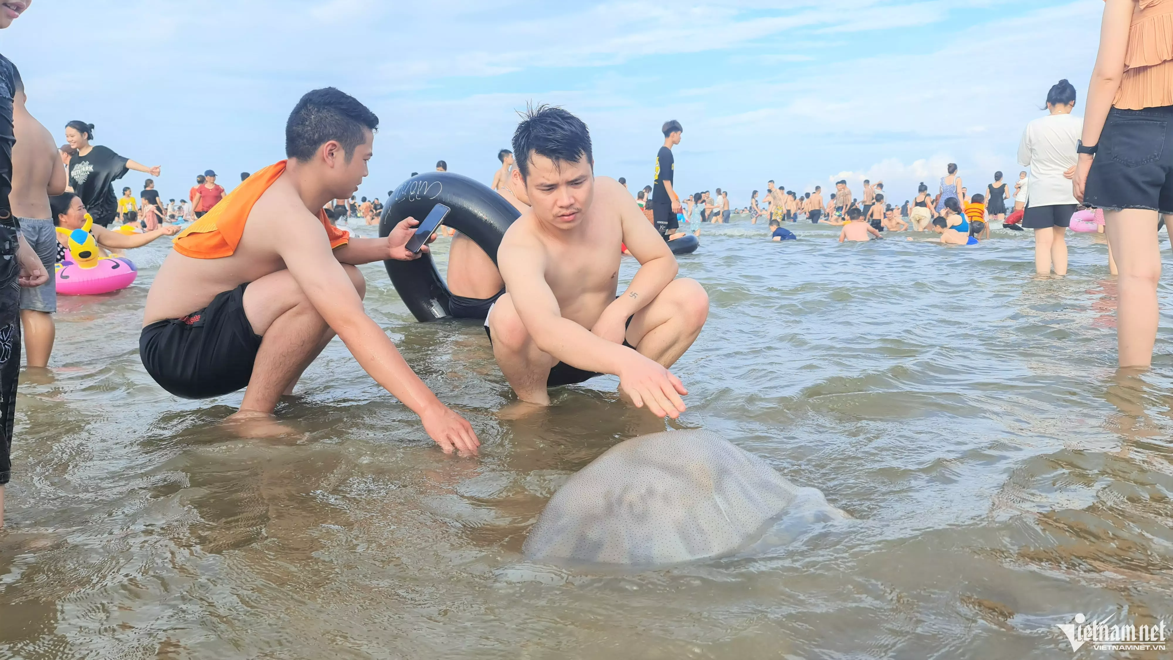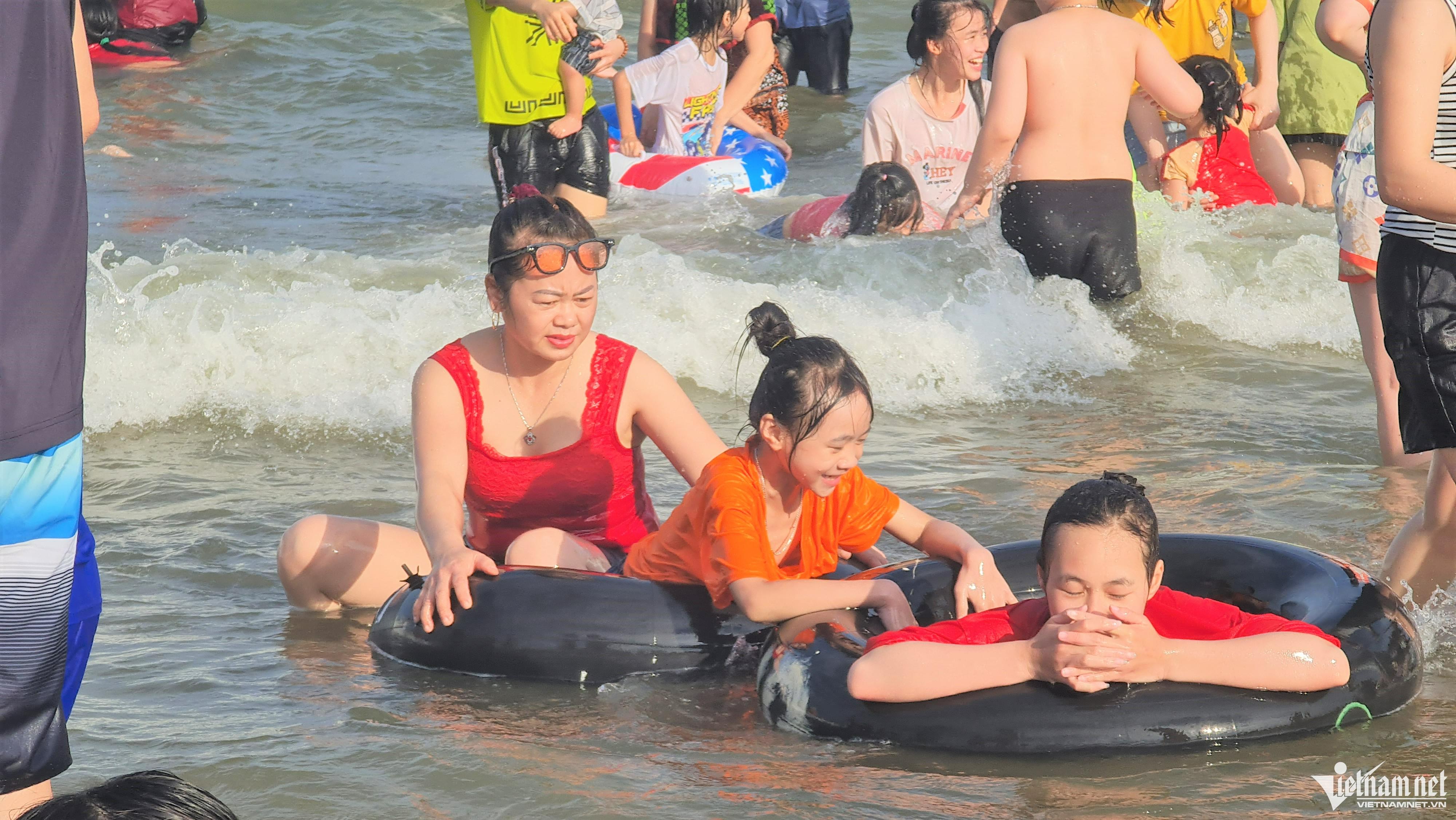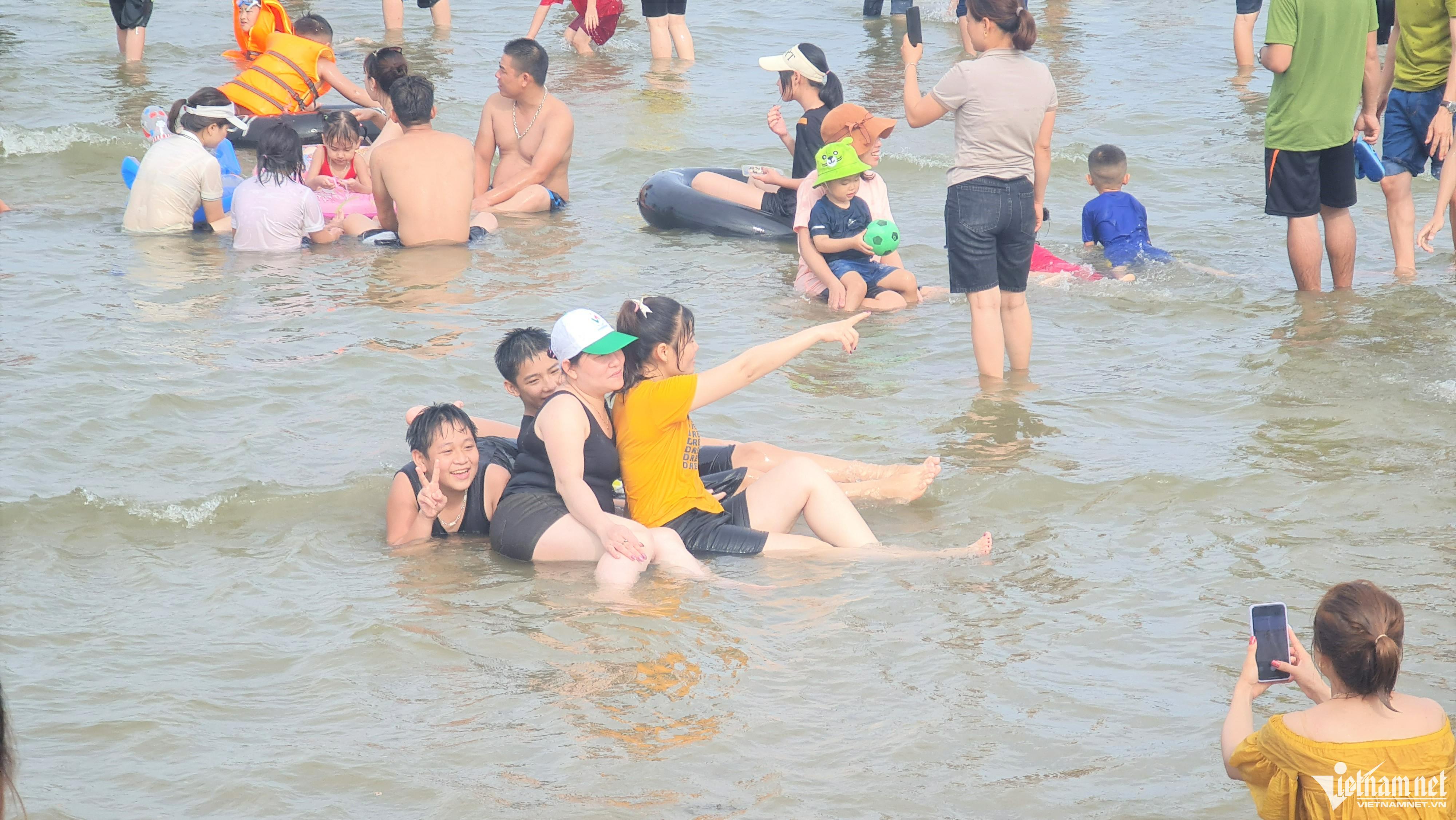 Thời tiết không nắng nên nhiều du khách đã xuống tắm biển ngay từ đầu giờ chiều, đến khoảng 16h, bãi biển đã ken cứng người.