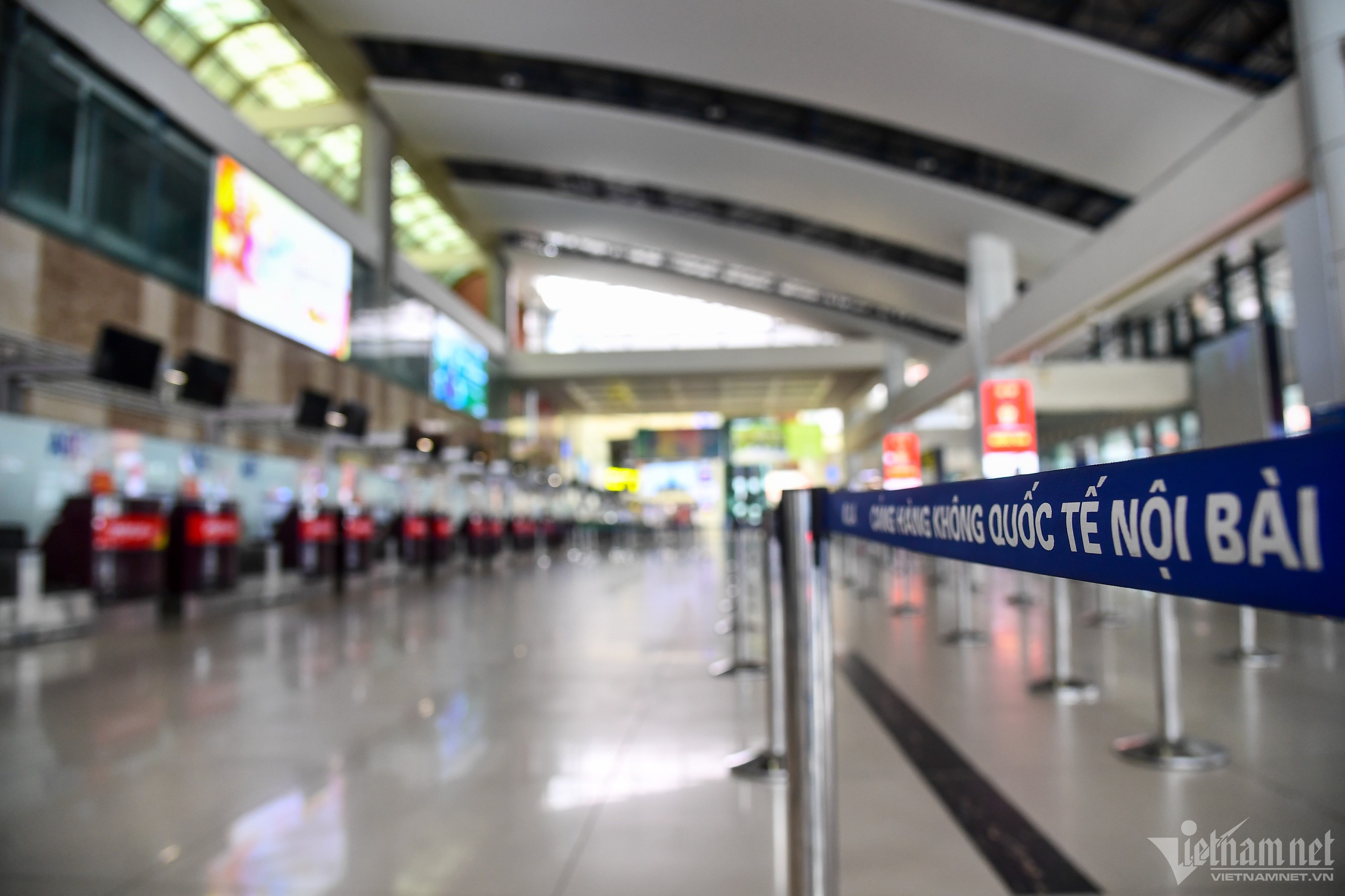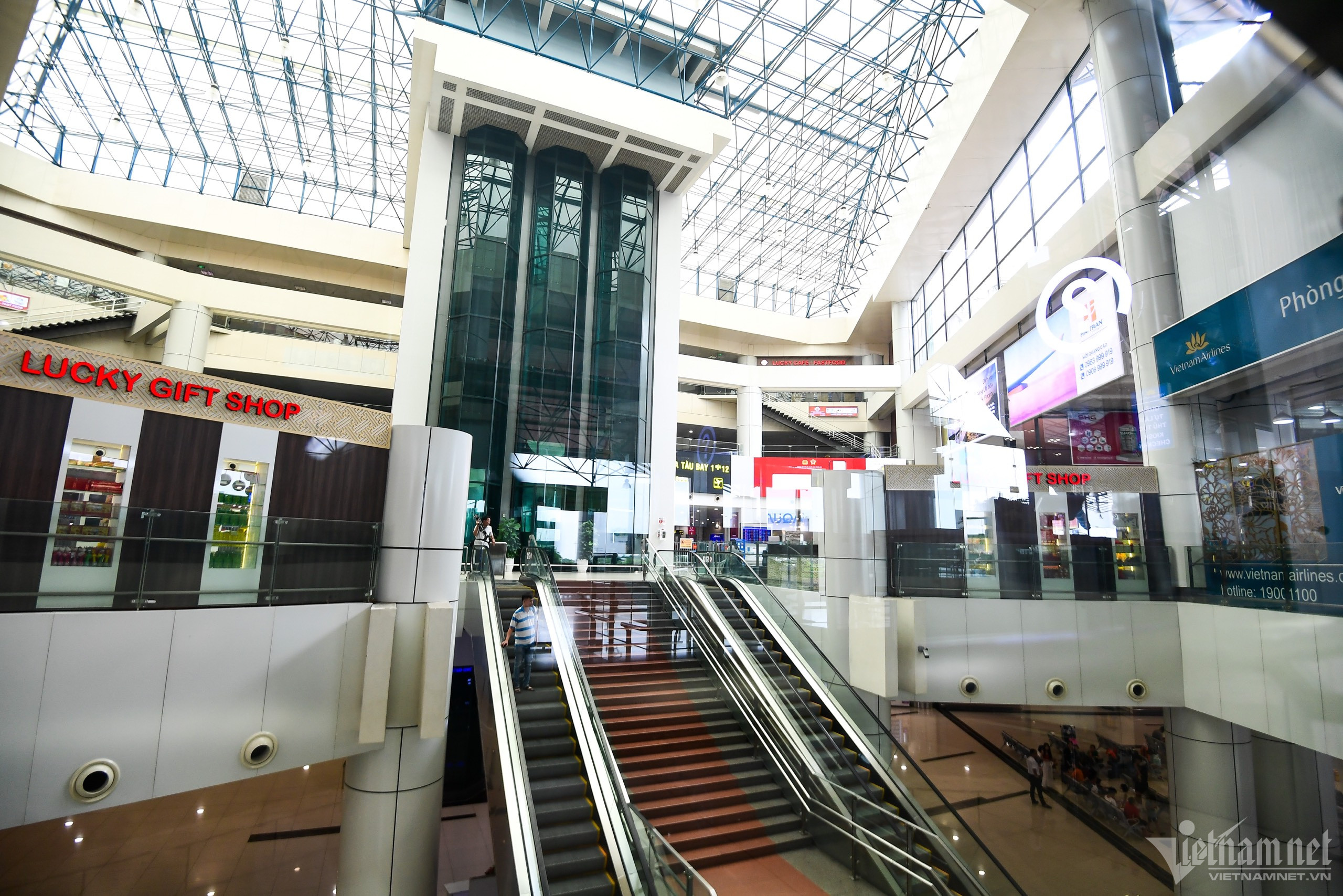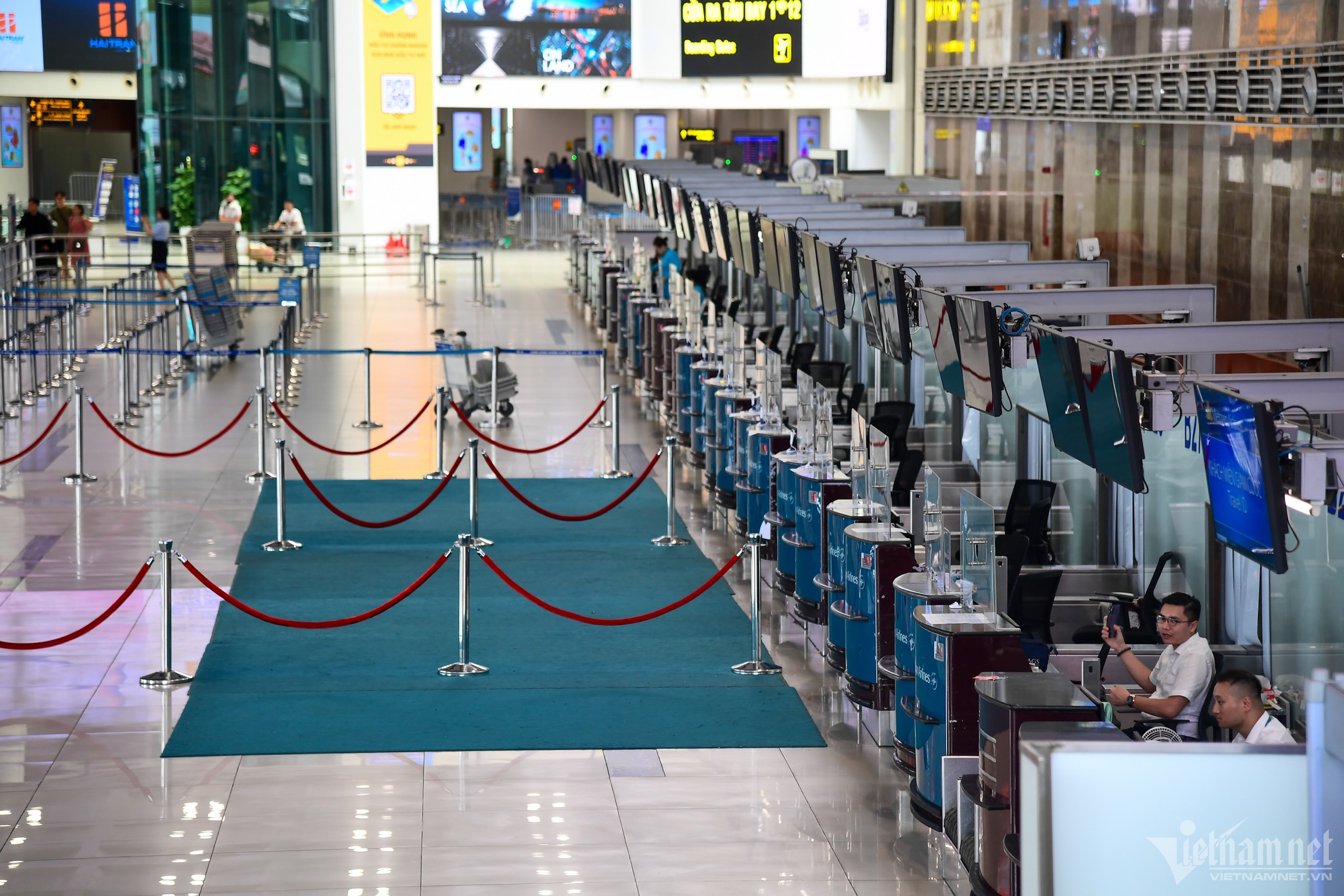 Trưa 18/7, phía trong và ngoài nhà ga T1, Cảng hàng không quốc tế Nội Bài (Hà Nội) rất vắng khách, nhiều bóng đèn được tắt, chỉ có nhân viên vệ sinh và lực lượng an ninh hàng không làm việc.