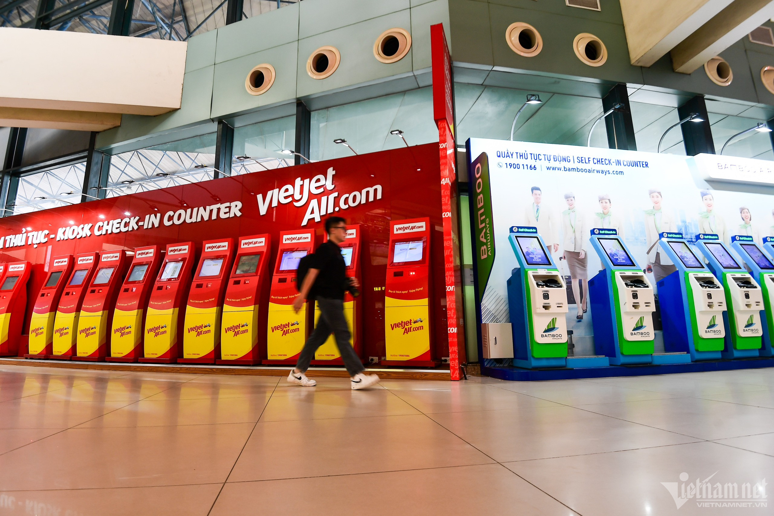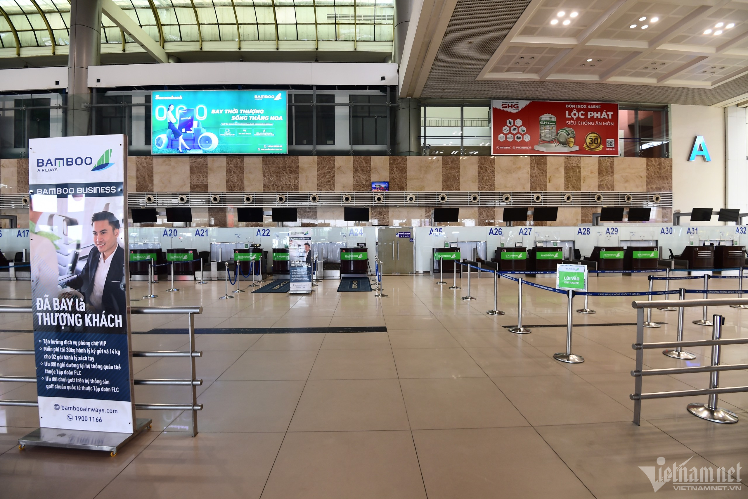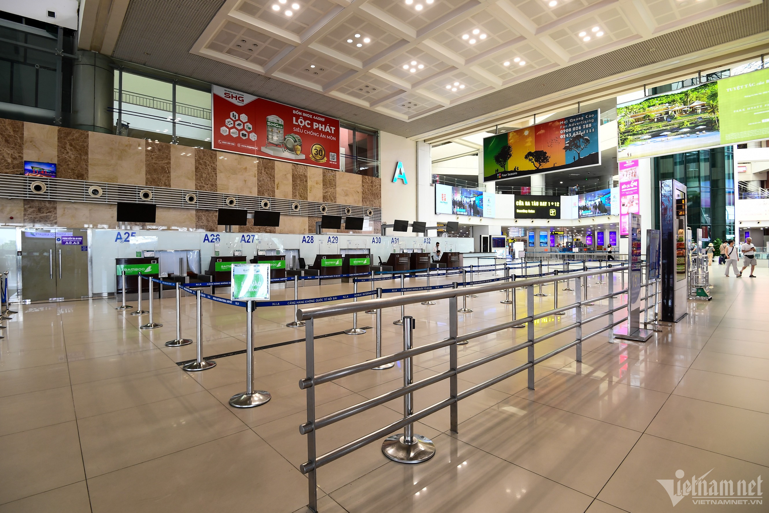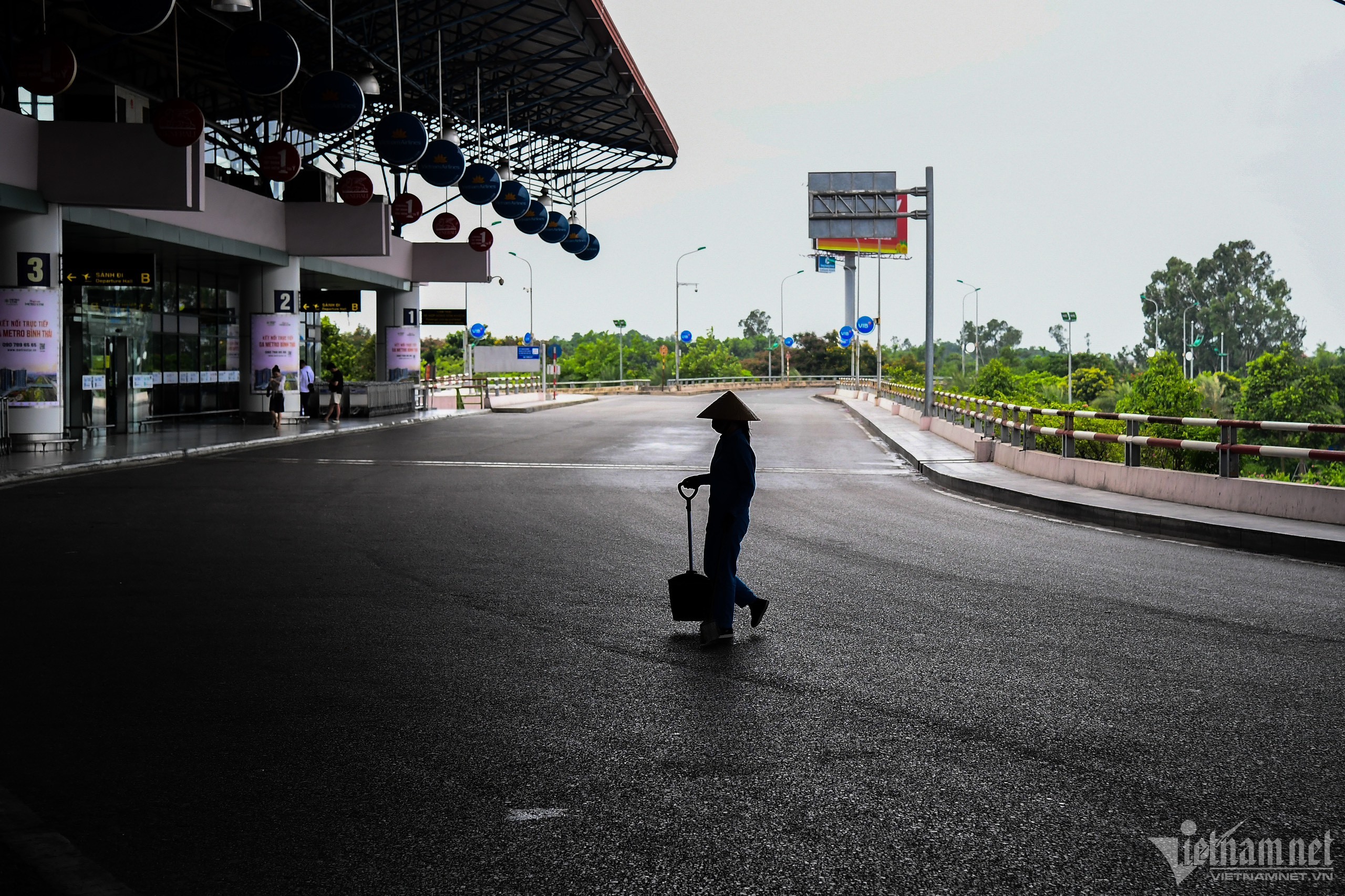 Trưa 18/7, phía trong và ngoài nhà ga T1, Cảng hàng không quốc tế Nội Bài (Hà Nội) rất vắng khách, nhiều bóng đèn được tắt, chỉ có nhân viên vệ sinh và lực lượng an ninh hàng không làm việc.