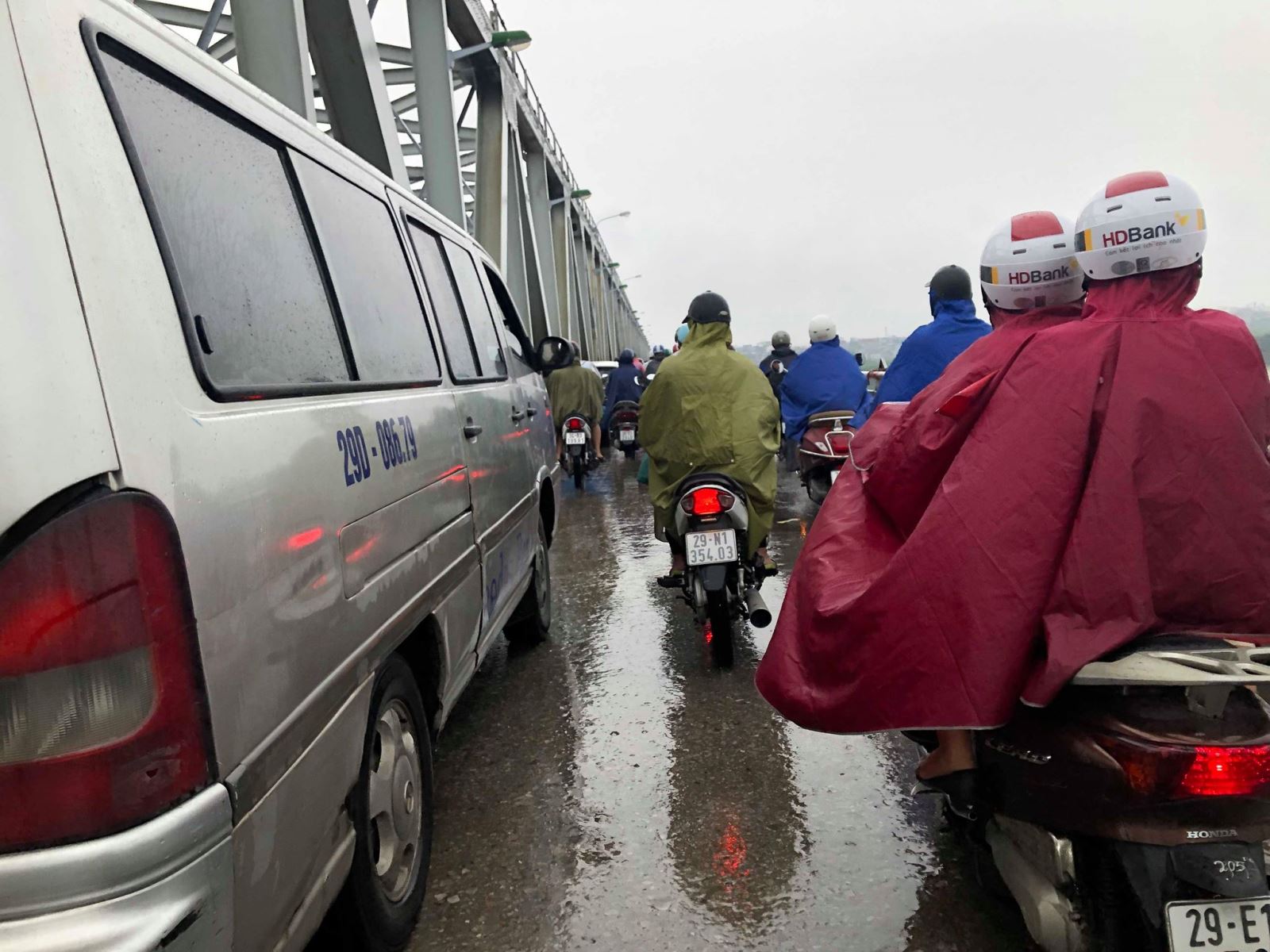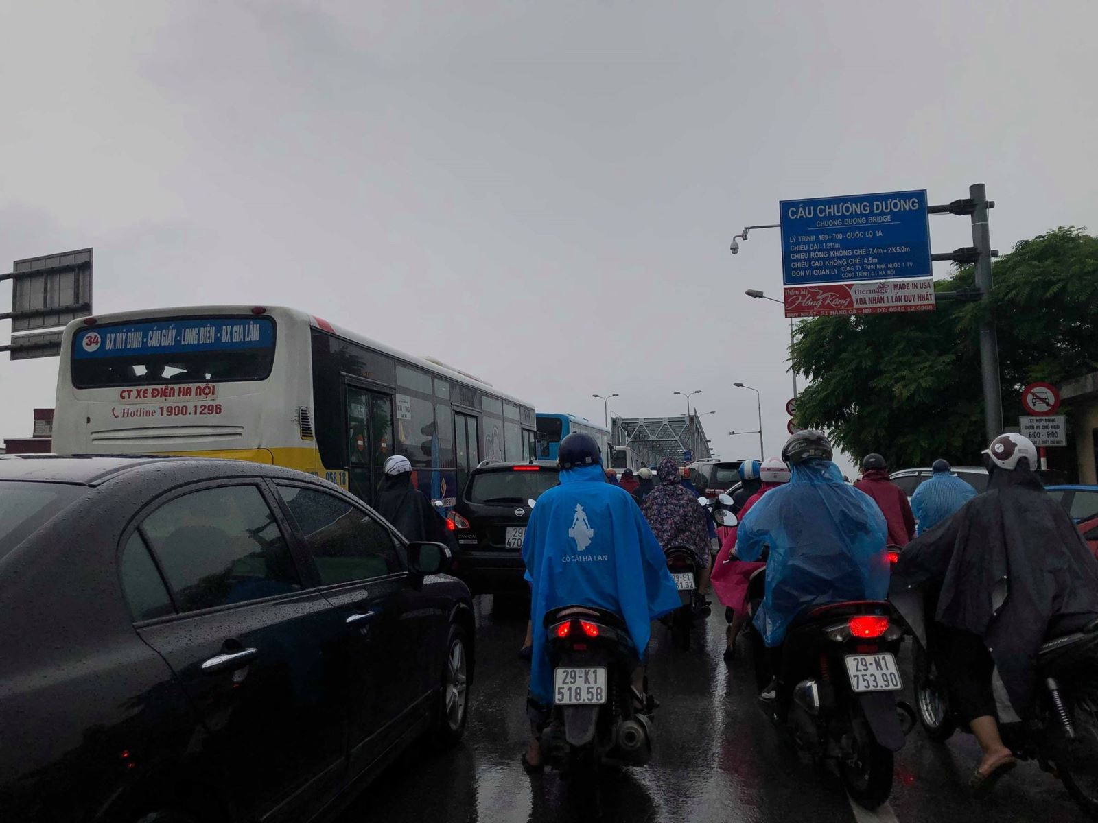 Sáng 19/9, Hà Nội xuất hiện mưa dông. Cơn mưa tuy không lớn nhưng đúng thời điểm đầu giờ sáng người dân đi làm, học sinh đến trường nên dọc tuyến đường Nguyễn Văn Cừ dẫn lên cầu Chương Dương hướng vào nội thành ùn tắc kéo dài.