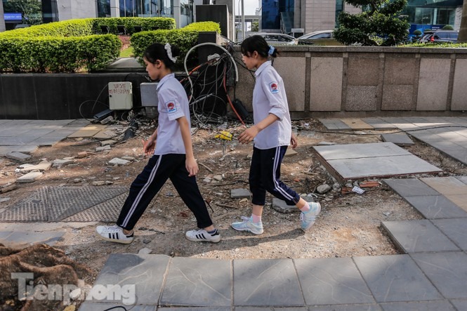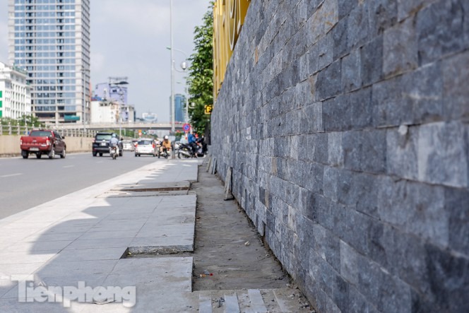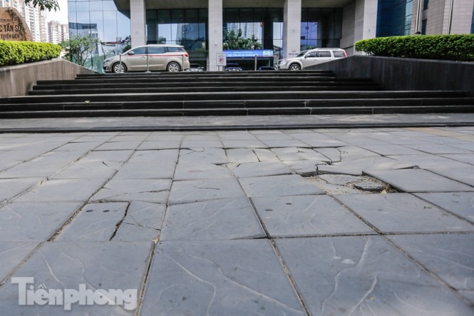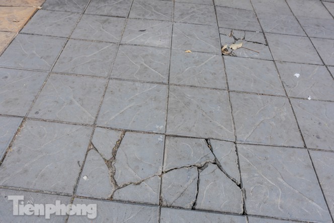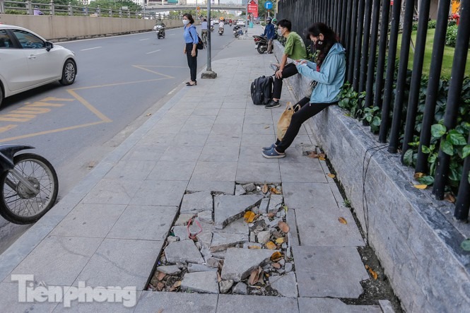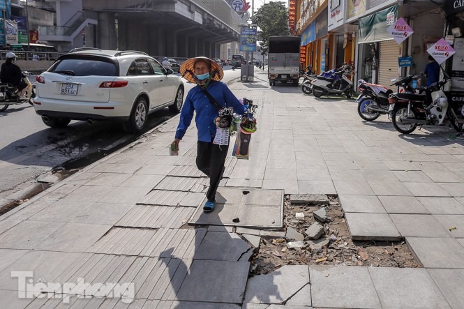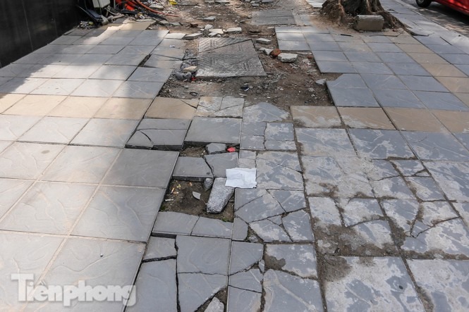 Ghi nhận của PV tại tuyến đường lớn, trung tâm của Thủ đô như Nguyễn Trãi, Nguyễn Xiển (quận Thanh Xuân), Trần Duy Hưng, Trung Kính (quận Cầu Giấy), vỉa hè ở đây đều đang lộ sự xuống cấp trầm trọng, xuất hiện nhiều "ổ voi" nứt vỡ, thậm chí nhiều viên gạch mới lát đã bong hẳn ra khỏi vỉa hè, vỡ vụn thành nhiều mảnh chỉ sau 3 năm lát đồng bộ.