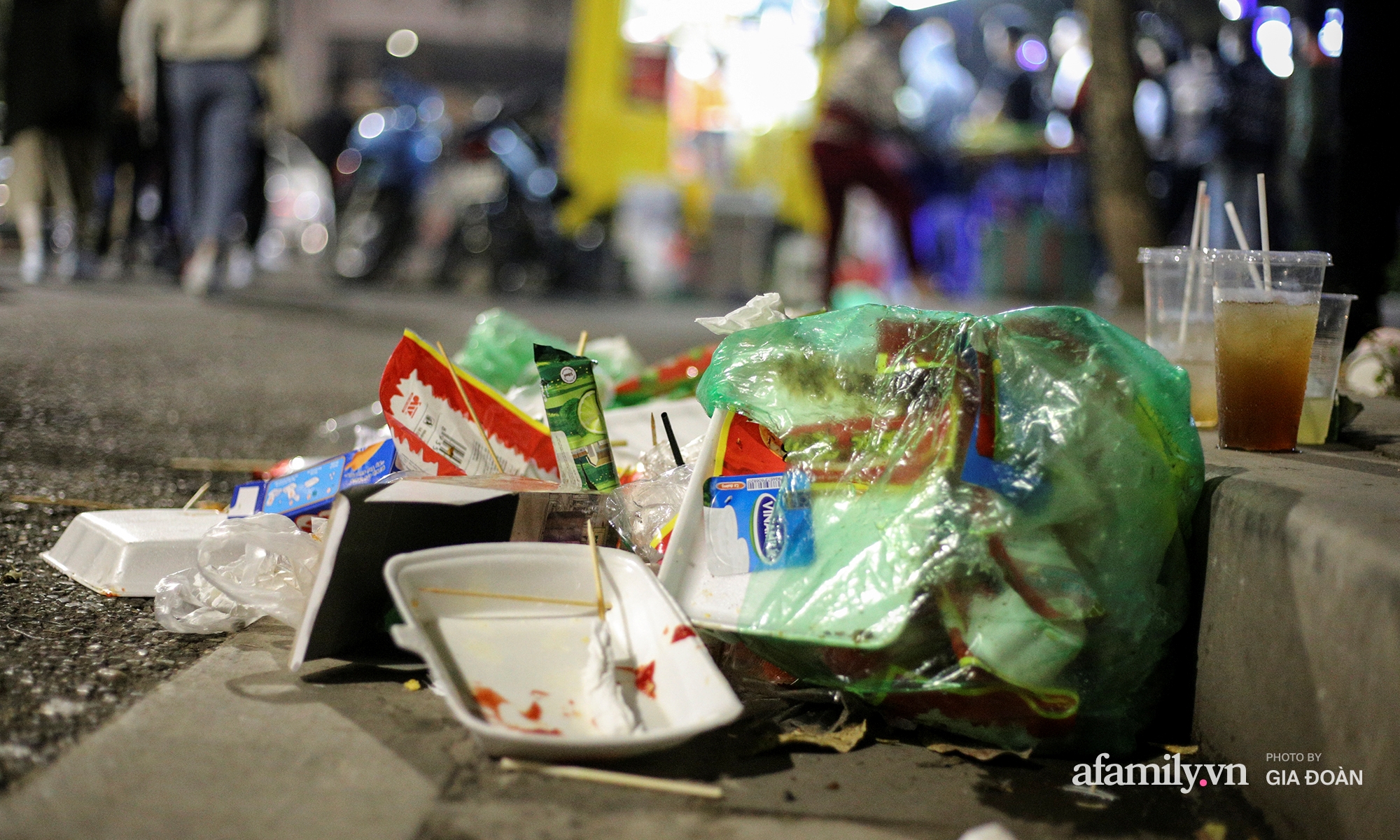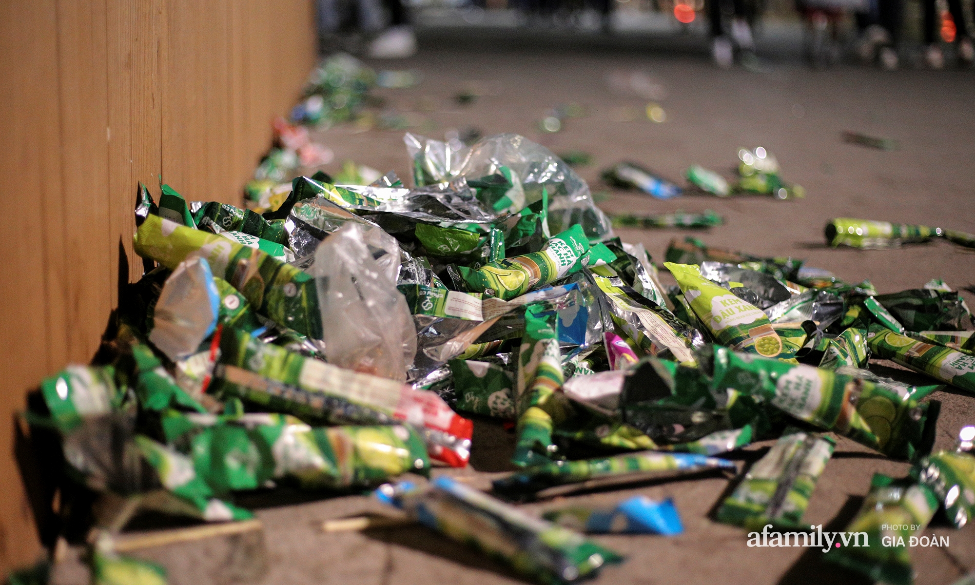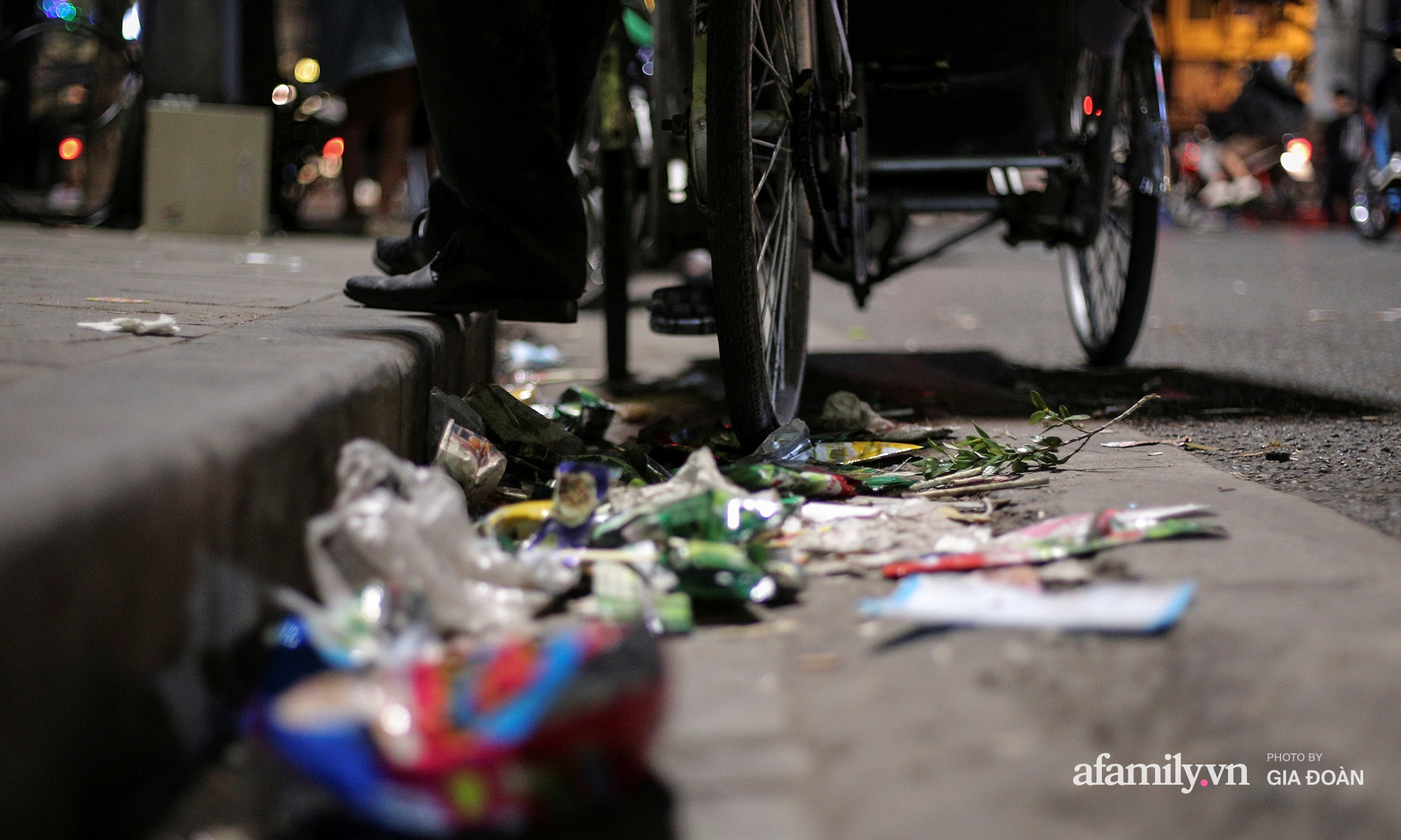 1h sáng, khi đêm Noel kết thúc cũng là lúc trên các tuyến phố khu vực trung tâm Hà Nội lại tràn ngập các loại rác như bao nilon, chai nhựa, vỏ kem... do người dân đi chơi bỏ lại.