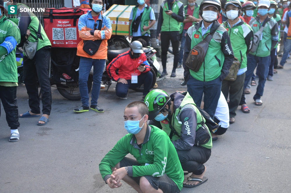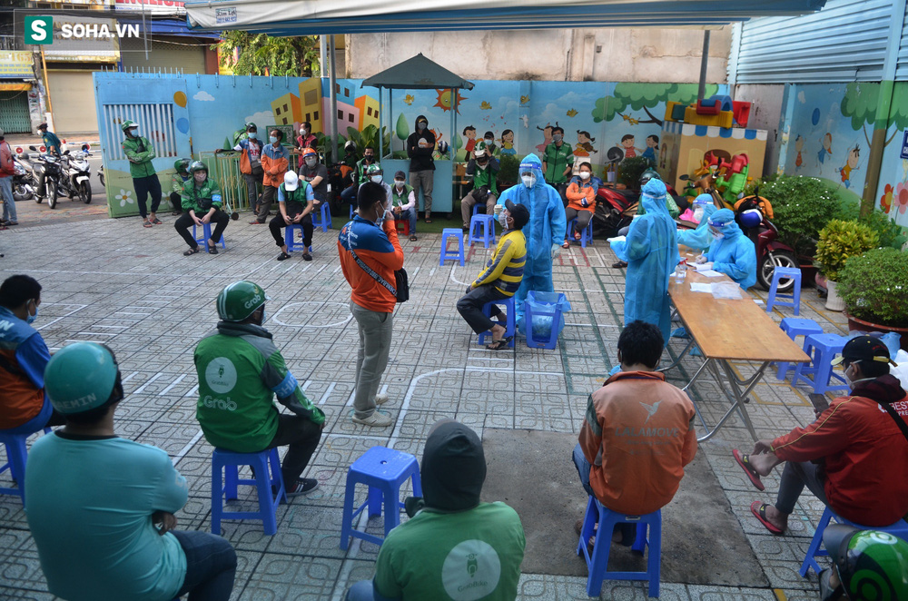 Hàng trăm shipper đứng đợi từ 4h sáng, kéo dài hơn trăm mét để chờ đến lượt được xét nghiệm. Các trạm y tế lưu động trên địa bàn thành phố lúng túng vì số lượng tăng cao.