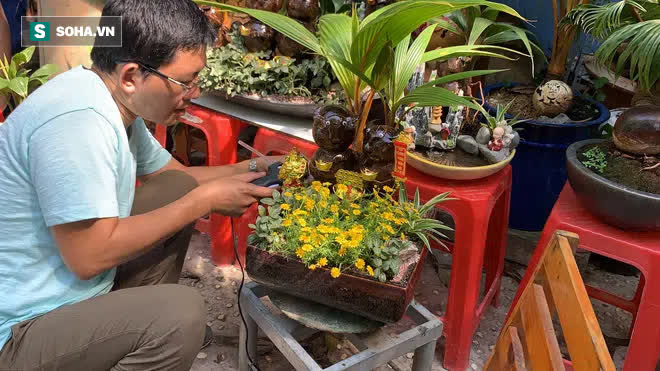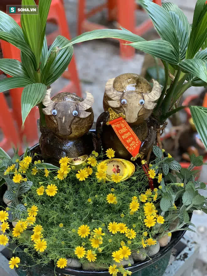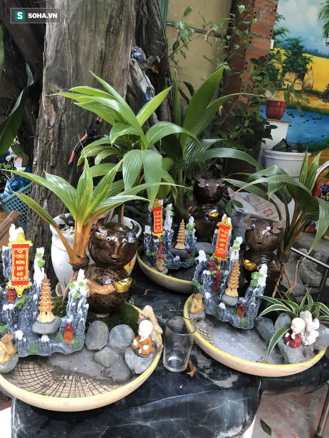 Anh Đinh Ngọc Hiếu tại TP HCM đã tận dụng những quả dừa khô tạo thành những chú trâu cõng vàng thu hút khách trên cả nước lùng mua trưng Tết.