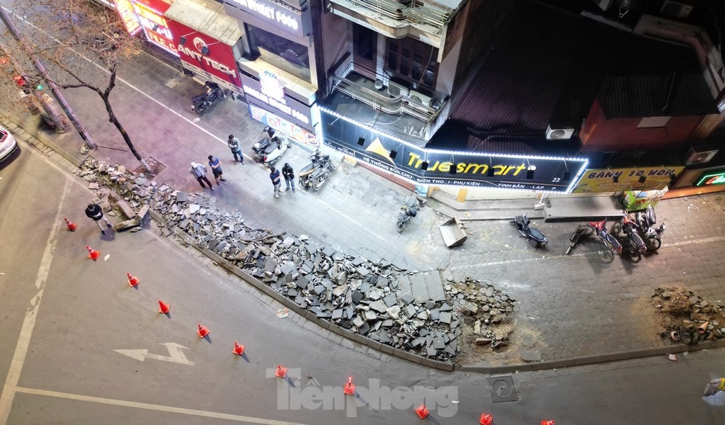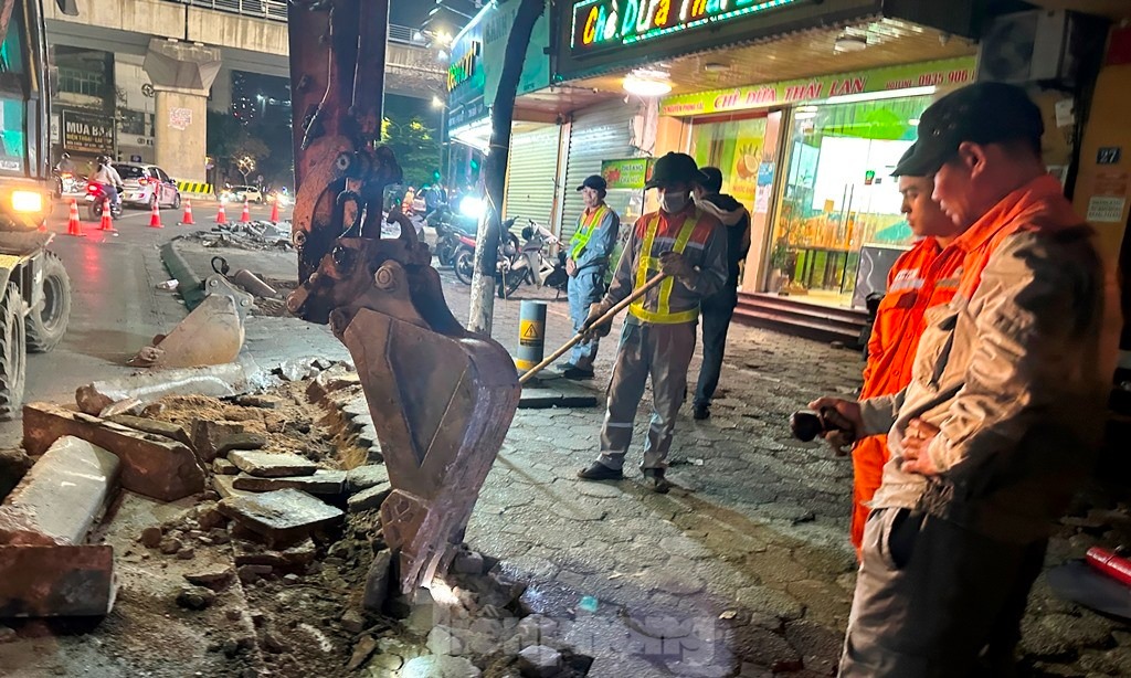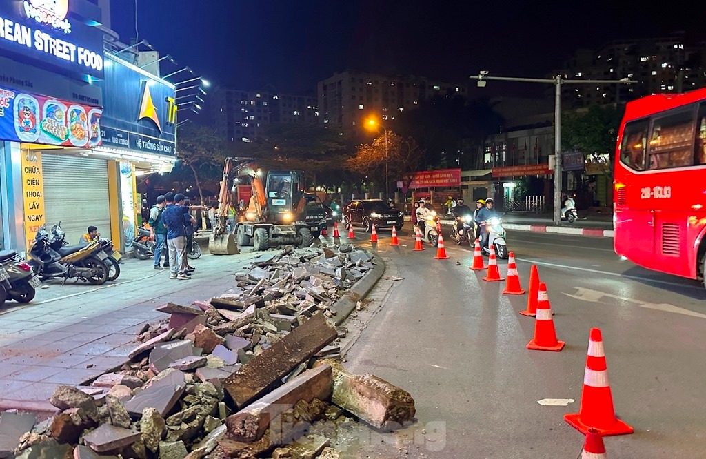 Trong đêm 13/4, tại đường Nguyễn Phong Sắc - Xuân Thủy để tăng khả năng lưu thông của các dòng xe muốn được rẽ phải sang đường Xuân Thủy, hàng chục công nhân và nhiều máy móc thi công đã được huy động đến và để xén bớt vỉa hè phố Nguyễn Phong Sắc.