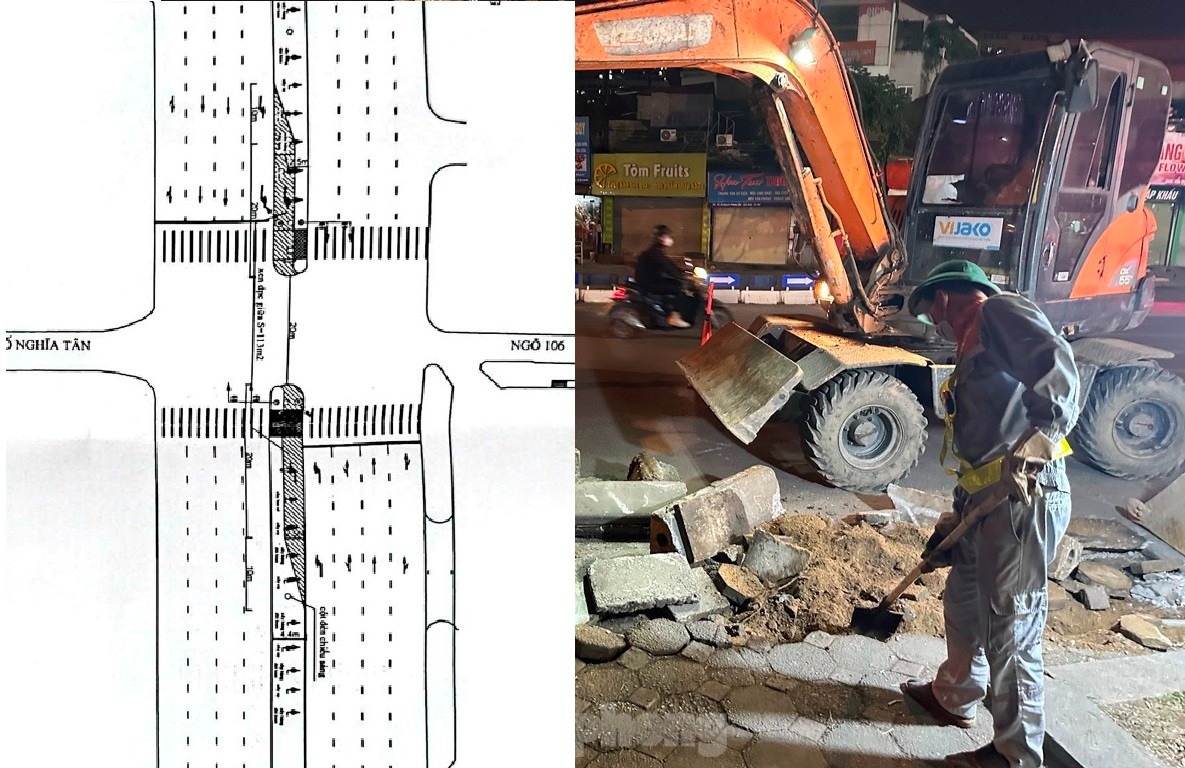 Tại nút Hoàng Quốc Việt- Nghĩa Tân - ngõ 106 Hoàng Quốc Việt, đơn vị thi công thực hiện xén dải phân cách giữa để mở rộng làn đường rẽ trái từ Hoàng Quốc Việt vào đường Nghĩa Tân và ngõ 106 Hoàng Quốc Việt, chiều dài 30m rộng gần 4m (diện tích 113 m2).