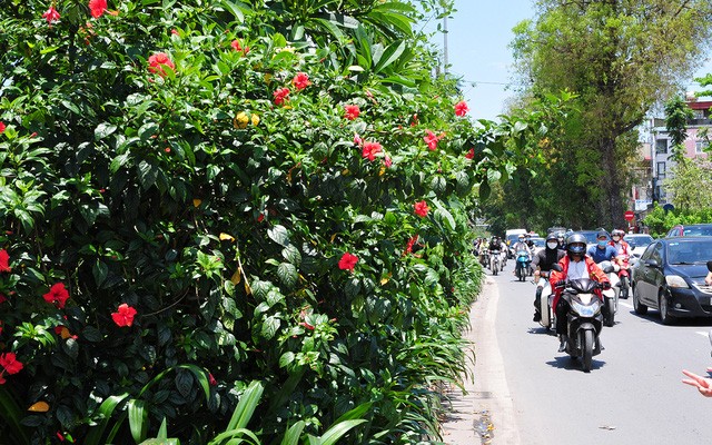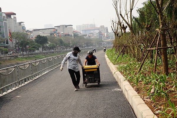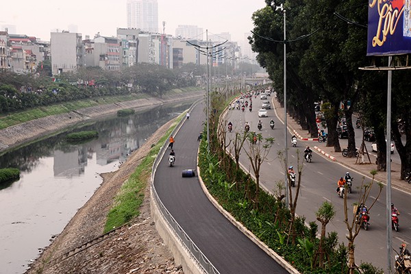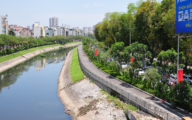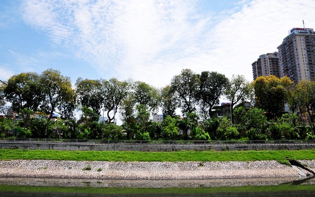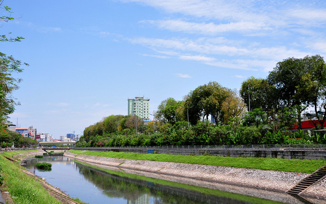 Nhìn từ xa, cả tuyến đường đi bộ dọc sông Tô Lịch như được phủ lớp áo xanh rì, mát rượi khác hẳn so với hình ảnh cách đây một năm.