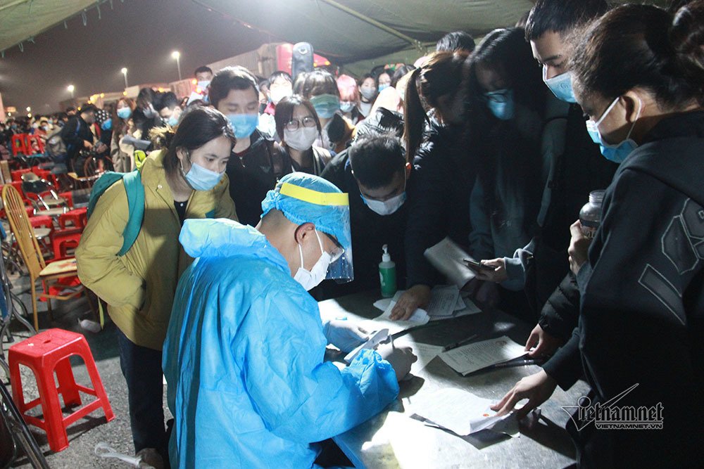 Dòng người đổ về ngày càng đông khiến lực lượng chức năng phải phân luồng, yêu cầu xếp hàng để chờ đến lượt khai báo y tế.