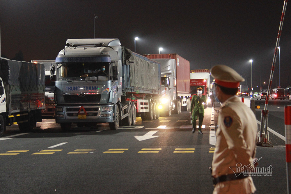 Lực lượng CSGT phải chốt chặn 3 đoạn để ngăn không cho ô tô vượt qua chốt kiểm soát.