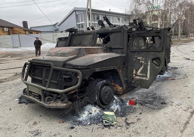 Trong ảnh: Dàn xe bọc thép đa năng Tigr-M bị cháy rụi ở Kharkiv ngày 28/2. Ảnh: Reuters