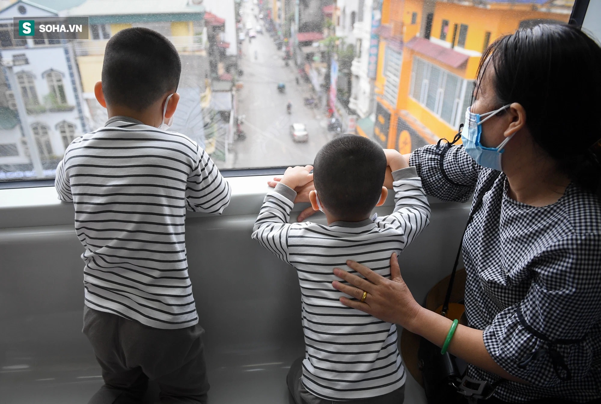 Quá háo hức với tàu đường sắt Cát Linh - Hà Đông, bé Minh Đức (5 tuổi) và Minh Trí (4 tuổi) được bà đưa từ Gia Lâm sang Cát Linh từ 7h sáng. Tuy vậy, 2 bé phải chờ đến 9h, sau khi lễ bàn giao hoàn tất mới được lên tàu. Minh Đức - Minh Trí liên tục nhìn qua cửa sổ lớn, khám phá phố phường Hà Nội với góc nhìn mới lạ.