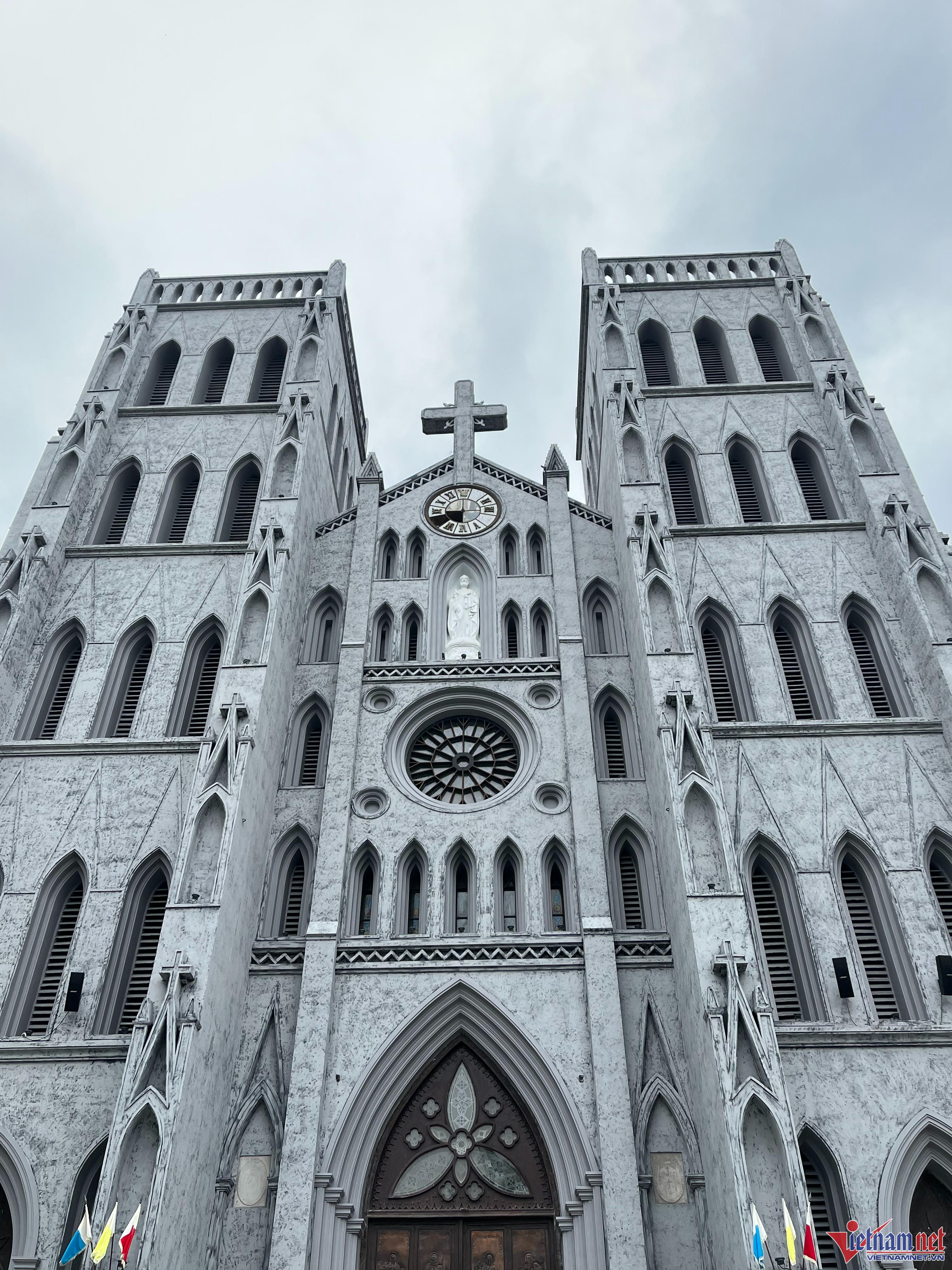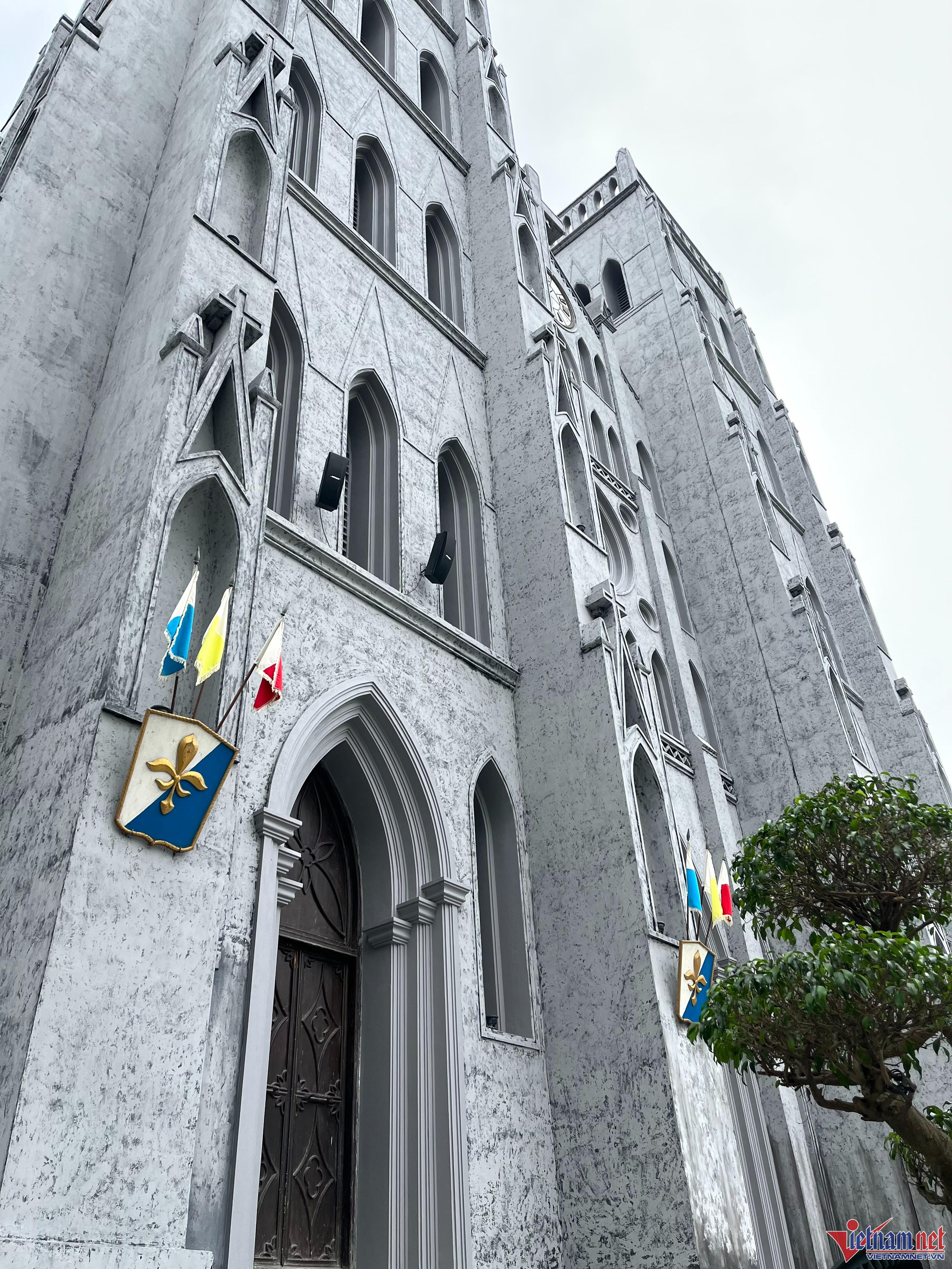 Sau lớp sơn thứ hai gây xôn xao 2 tuần trước, lớp sơn thứ ba vừa được phủ lên mặt trước Nhà thờ Lớn Hà Nội có tông màu trắng xám với những vệt loang ghi đậm, mang đến cảm giác cổ kính, xưa cũ như trước khi tu sửa.