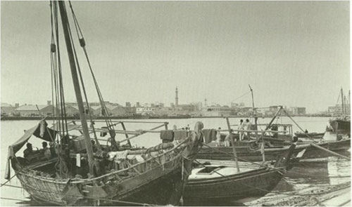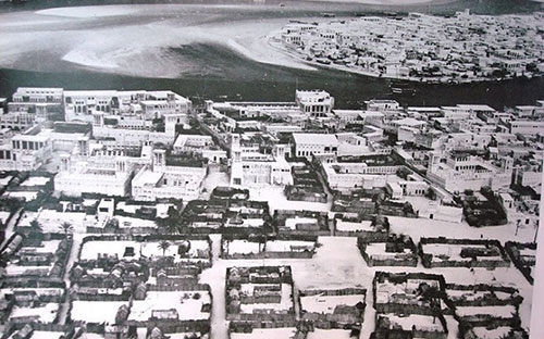 Trung tâm thành phố Dubai những năm 1950-1960. Kể từ khi thành lập năm 1833, thành phố Dubai chỉ có vỏn vẹn 800 người, chủ yếu là ngư dân. |