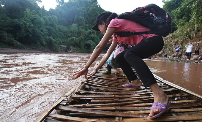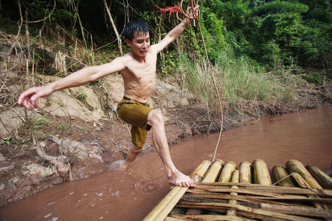 Những chiếc bè được kết bằng 10 cây tre, chỉ chở tối đa được sáu người và phải đưa đón làm nhiều chuyến. "Đoạn suối này từng có người chết đuối, một số xe máy của giáo viên và người dân rơi xuống đây hư hỏng", thầy Việt cho hay. |