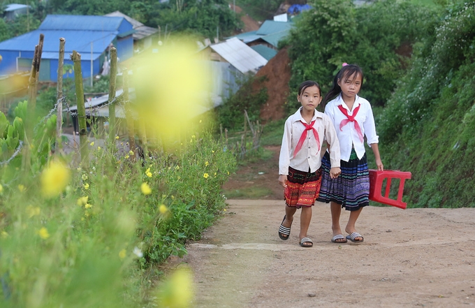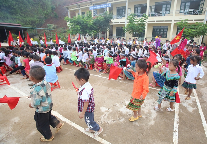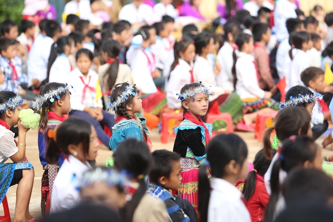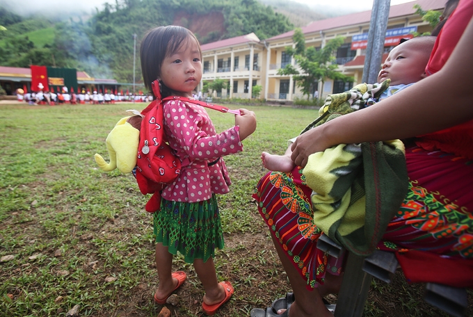 Em Giảng Thị Dương được mẹ đưa xuống trường từ sớm để dự khai giảng năm học mới. Đây là lần đầu tiên em dự lễ khai giảng tại ngôi trường lớn ở địa phương. |